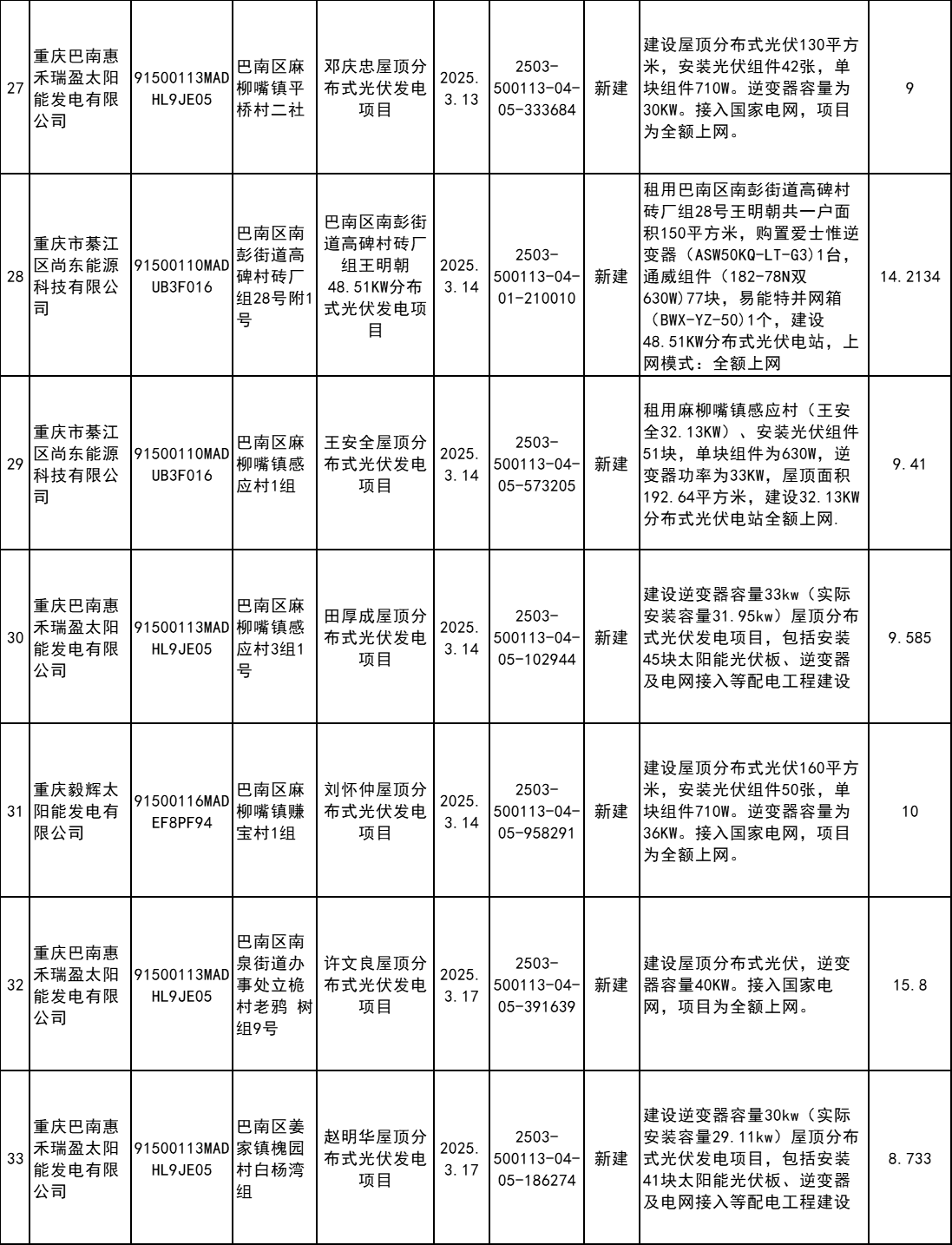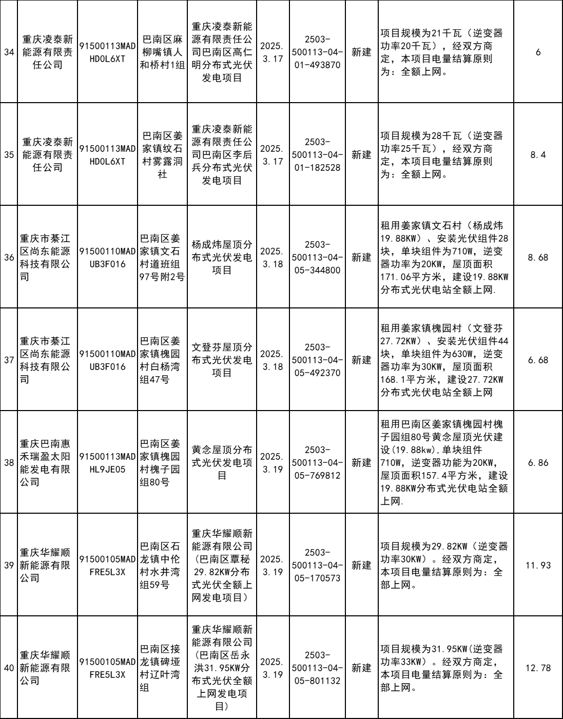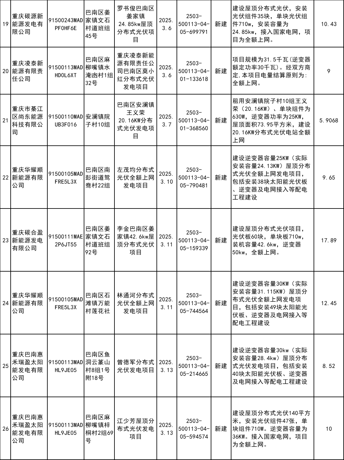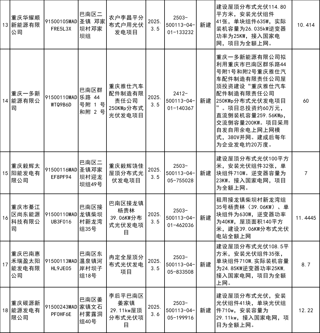 4月7日,重慶市巴南區(qū)發(fā)改委發(fā)布2025年企業(yè)投資項(xiàng)目備案統(tǒng)計(jì)表(3月)。根據(jù)公示信息,3月巴南區(qū)共計(jì)備案60個(gè)分布式光伏項(xiàng)目。