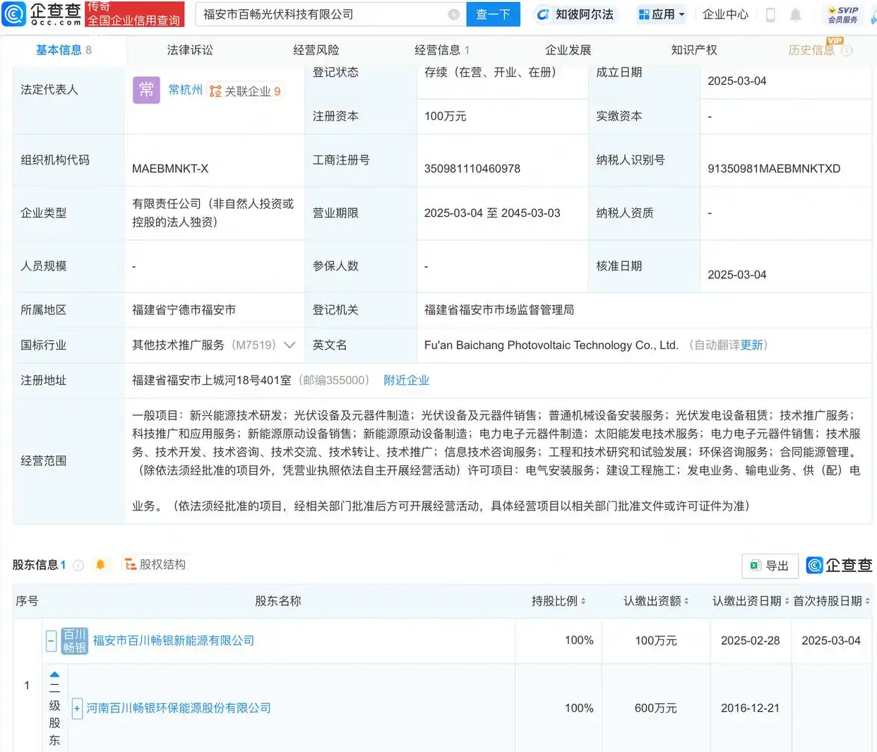 企查查APP顯示,近日,福安市百暢光伏科技有限公司成立,法定代表人為常杭州,注冊(cè)資本100萬(wàn)元,經(jīng)營(yíng)范圍包含:新興能源技術(shù)研發(fā);光伏設(shè)備及元器件制造;光伏設(shè)備及元器件銷售;普通機(jī)械設(shè)備安裝服務(wù)等。企查查股權(quán)穿透顯示,該公司由百川暢銀(300614)間接全資持股。