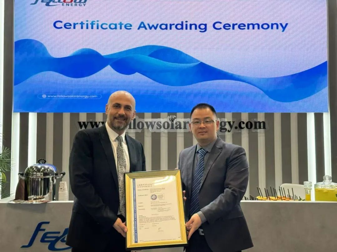 2025年4月10日,第17屆太陽能及儲能展Solarex在伊斯坦布爾展覽中心盛大開幕!Fellow Energy作為土耳其首個本土TIER 1 組件制造商,攜創(chuàng)新光伏產(chǎn)品和解決方案強(qiáng)勢登場,展臺8C09瞬間化身全場焦點(diǎn),人潮涌動,熱度爆表! 現(xiàn)場直擊 隨著 "土耳其首張TüV LETID認(rèn)證授證儀式"的啟動,全場氣氛達(dá)到高潮!南德意志集團(tuán)智慧能源銷售總監(jiān)李金金先生親臨展臺,為FellowEnergy頒發(fā)這一象征光伏組件長期可靠性的權(quán)威認(rèn)證。李總監(jiān)表示:"LETID認(rèn)證是光伏行業(yè)技術(shù)實(shí)力的試金石,標(biāo)志著Fellow Energy作為土耳其本土企業(yè)在產(chǎn)品品質(zhì)上實(shí)現(xiàn)了巨大突破!" 土耳其首個本土Tier 1 和 首張TüV LETID認(rèn)證——不僅僅是對Fellow Energy技術(shù)實(shí)力的認(rèn)可,更是對土耳其本土能源產(chǎn)業(yè)崛起的見證! 黑科技場景:家庭能源革命,看得見的未來! 步入展臺,兩大創(chuàng)新場景令人駐足: 家庭能源生態(tài)展區(qū) 從柔性光伏到便攜式折疊發(fā)電包再到創(chuàng)新太陽能空調(diào)解決方案,以"Flexible Solar, Endless Possibilities"為核心,將"零碳家庭"變?yōu)橛|手可及的現(xiàn)實(shí)。 全息投影實(shí)驗(yàn)室 懸浮在空中的N型組件結(jié)構(gòu)動態(tài)演示,揭秘組件如何實(shí)現(xiàn)高轉(zhuǎn)化率。 穿越關(guān)稅風(fēng)暴: 土耳其智造,全球化布局的定心丸! 面對近期美國對光伏產(chǎn)品加征50%關(guān)稅的動蕩局勢,F(xiàn)ellow Energy"土耳其本土化戰(zhàn)略"成為客戶熱議焦點(diǎn)。數(shù)據(jù)顯示,依托土耳其10%的低關(guān)稅優(yōu)勢及本土工廠的靈活供應(yīng),F(xiàn)ellow Energy客戶成本波動率僅為行業(yè)平均值的1/3。 "這不是運(yùn)氣,是十年布局的前瞻眼光。當(dāng)別人還在為關(guān)稅焦慮時(shí),我們已是土耳其本土首個Tier-1制造商。選擇Fellow Energy,就是選擇穿越周期的確定性。" 傍晚,展臺秒變音樂廳!土耳其知名樂隊(duì)以一曲《Solar Rhythm》開啟 "Fellow Happy Hour音樂會",觀眾手持本土特調(diào)飲品,在光影交織中沉浸式感受科技與藝術(shù)的碰撞。