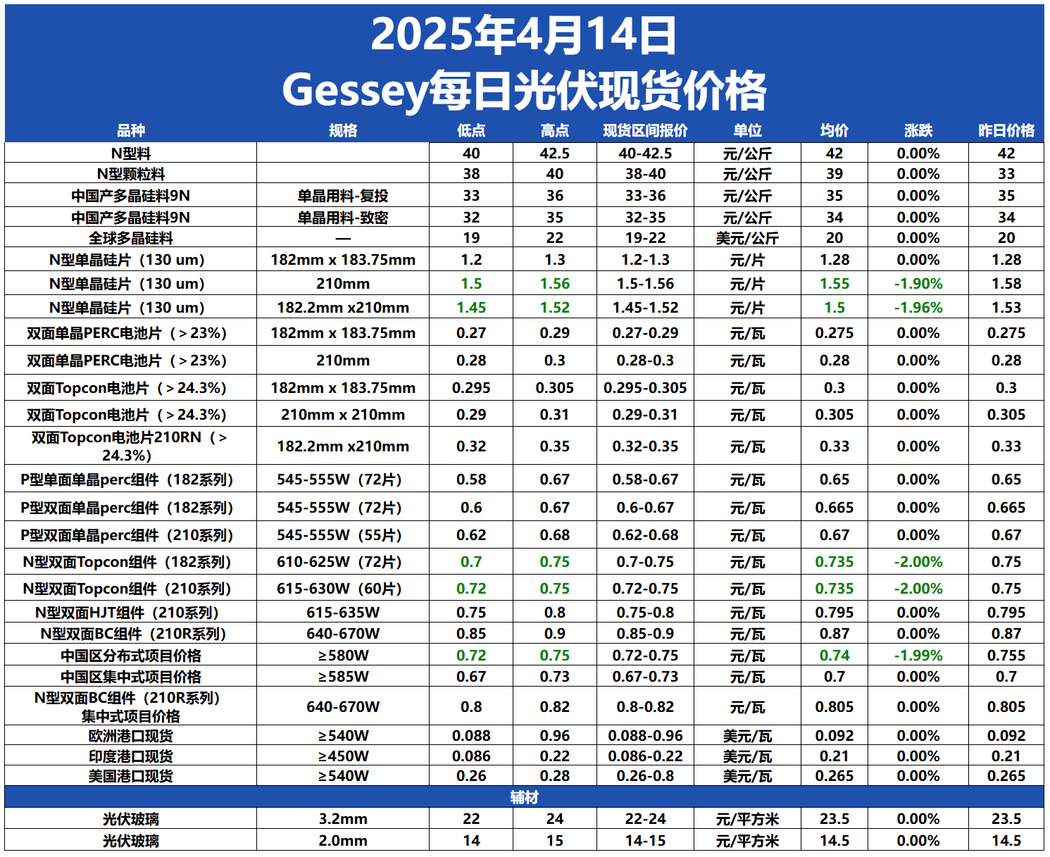 現(xiàn)貨市場價格變動: 多晶硅: 今日硅料價格整體維穩(wěn),N型料主流價格在40-42.5元/公斤,均價42元/公斤。N型顆粒硅主流價格在38-40元/公斤,均價39元/公斤。國產(chǎn)復(fù)投特級硅料主流價格在33-36元/公斤,均價35元/公斤,國產(chǎn)致密特級硅料主流價格在32-35元/公斤,均價34元/公斤。全球多晶硅料主流價格在19-22元/公斤,均價20元/公斤。 硅片: 今日硅片價格小幅下跌,N型-183.75mm單晶硅片主流現(xiàn)貨價格維持1.2-1.3元/片,均價1.28元/片。N型-210mm單晶硅片主流現(xiàn)貨價格維持1.5-1.6元/片,均價1.55元/片,下降-1.90%。N型-210Rmm單晶硅片主流現(xiàn)貨價格1.45-1.55元/片,均價1.5元/片,下降-1.96%。 電池片: 今日電池片價格整體維穩(wěn),23%以上183.75mm尺寸雙面單晶perc主流價格在0.27-0.29元/瓦,均價0.275元/瓦。23%以上210mm雙面單晶perc主流價格在0.28-0.3元/瓦,均價0.28元/瓦。24.3%以上183.75mm雙面Topcon電池片主流價格在0.295-0.305元/瓦,均價0.3元/瓦。24.3%以上210mm雙面Topcon電池片主流價格在0.29-0.31元/瓦,均價0.305元/瓦。24.3%以上210Rmm雙面Topcon電池片主流價格在0.32-0.35元/瓦,均價0.33元/瓦。 組件: 今日組件價格小幅下跌,雙面單晶perc組件(182系列)價格在0.6-0.67元/ 瓦,均價為0.665元/瓦。雙面單晶perc組件(210系列)價格在0.62-0.68元/ 瓦,均價為0.67元/瓦。N型雙面Topcon 組件(182系列)價格在0.7-0.75元/ 瓦,均價為0.735元/瓦,下降-2.00%。 N型雙面Topcon 組件(210系列)價格在0.72-0.75元/ 瓦,均價為0.735元/瓦,下降-2.00%。 N型雙面HJT組件(210系列)價格在0.75-0.8元/ 瓦,均價為0.795元/瓦。N型雙面BC組件(210R系列)價格在0.85-0.9元/ 瓦,均價為0.87元/瓦。中國區(qū)分布式項目(≥580W)價格在0.72-0.75元/瓦,均價為0.74元/瓦,中國區(qū)集中式項目(≥585W)價格在0.67-0.73元/ 瓦,均價為0.7元/瓦。N型雙面BC組件(210R系列)集中式項目價格在0.8-0.82元/ 瓦,均價為0.805元/瓦。歐洲港口現(xiàn)貨價格在0.088-0.96美元/ 瓦,均價為0.092美元/瓦。印度港口現(xiàn)貨價格在0.086-0.22美元/ 瓦,均價為0.21美元/瓦。美國港口現(xiàn)貨價格在0.26-0.28美元/ 瓦,均價為0.265美元/瓦。 玻璃: 今日玻璃價格整體維穩(wěn),3.2mm雙層鍍膜光伏玻璃價格在22-24元/平方米,均價為23.5元/平方米。2.0mm雙層鍍膜光伏玻璃價格在14-15元/平方米,均價為14.5元/平方米。 聚焦每日行情波動: 今日硅片價格小幅下跌,N型-183.75mm單晶硅片主流現(xiàn)貨價格維持1.2-1.3元/片,均價1.28元/片。N型-210mm單晶硅片主流現(xiàn)貨價格維持1.5-1.6元/片,均價1.55元/片,下降-1.90%。N型-210Rmm單晶硅片主流現(xiàn)貨價格1.45-1.55元/片,均價1.5元/片,下降-1.96%。硅片價格由于市場預(yù)期后續(xù)終端需求減弱,“430” 節(jié)點即至,下游觀望情緒明顯增加,市場預(yù)期后續(xù)終端組件需求下降,帶動電池消耗降低。搶裝潮陸續(xù)結(jié)束,使得硅片需求也隨之減弱,市場從供應(yīng)緊張逐漸轉(zhuǎn)向供應(yīng)寬松,另外市場疊加美國關(guān)稅政策的影響,整個市場氣氛轉(zhuǎn)弱,促使硅片價格開始下行。在本輪價格波動中,主流規(guī)格N210R 對市場變化極為敏感。當(dāng)市場需求出現(xiàn)回落時,N210R規(guī)格率先受到?jīng)_擊,進(jìn)而帶動其他各規(guī)格硅片價格紛紛調(diào)降 。 今日組件價格小幅下跌,雙面單晶perc組件(182系列)價格在0.6-0.67元/ 瓦,均價為0.665元/瓦。雙面單晶perc組件(210系列)價格在0.62-0.68元/ 瓦,均價為0.67元/瓦。N型雙面Topcon 組件(182系列)價格在0.7-0.75元/ 瓦,均價為0.735元/瓦,下降-2.00%。N型雙面Topcon 組件(210系列)價格在0.72-0.75元/ 瓦,均價為0.735元/瓦,下降-2.00%。4月份各企業(yè)訂單均已落實,但新訂單洽談主要圍繞遠(yuǎn)期項目展開在這樣的背景下,組件企業(yè)普遍面臨客戶壓價的情況。目前針對遠(yuǎn)期訂單,價格相對混亂回落,短期價格仍處于小幅波動態(tài)勢。 期貨市場