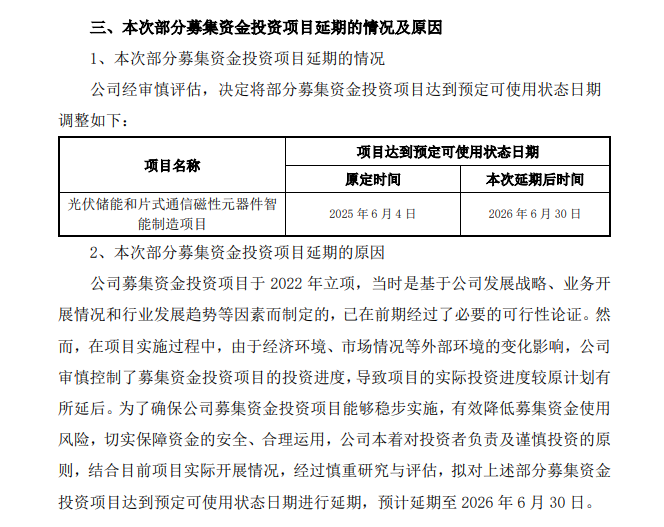 4月22日,東莞銘普光磁股份有限公司宣布,對“光伏儲能和片式通信磁性元器件智能制造項目”投資建設(shè)完成時間進行延期調(diào)整,預(yù)計延期至2026 年 6 月 30 日。 延期原因在項目實施過程中,由于經(jīng)濟環(huán)境、市場情況等外部環(huán)境的變化影響,公司審慎控制了募集資金投資項目的投資進度,導(dǎo)致項目的實際投資進 度較原計劃有所延后。為了確保公司募集資金投資項目能夠穩(wěn)步實施,有效降低募集資金使用風險,切實保障資金的安全、合理運用,公司本著對投資者負責及謹慎投資的原則,結(jié)合目前項目實際開展情況,經(jīng)過慎重研究與評估,擬對上述部分募集資金投資項目達到預(yù)定可使用狀態(tài)日期進行延期,預(yù)計延期至 2026 年 6 月 30 日。