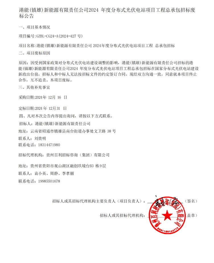 近日,港能(鎮(zhèn)雄)新能源有限責(zé)任公司發(fā)布2024年度分布式光伏電站項(xiàng)目工程總承包招標(biāo)廢標(biāo)公告,其300MW分布式光伏EPC項(xiàng)目合作終止。 根據(jù)公告,因受到國(guó)家政策對(duì)分布式光伏電站建設(shè)調(diào)整的影響,港能(鎮(zhèn)雄)招標(biāo)的2024年度分布式光伏電站項(xiàng)目工程總承包招標(biāo)在國(guó)家分布式光伏電站建設(shè)新政出臺(tái)前,招標(biāo)人和中標(biāo)人無(wú)法按招標(biāo)文件的約定簽訂合同?,F(xiàn)經(jīng)雙方溝通一致,同意就本項(xiàng)目終止合作,互不追責(zé)。本項(xiàng)目廢標(biāo)。 根據(jù)公開(kāi)信息顯示,該項(xiàng)目招標(biāo)啟動(dòng)于2024年12月擬在昭通市鎮(zhèn)雄縣尖山鄉(xiāng)、木卓鎮(zhèn)、杉樹(shù)鄉(xiāng)、花朗多;昭通市鎮(zhèn)雄縣五德鎮(zhèn),潑機(jī)鎮(zhèn),羅坎鎮(zhèn),赤水源鎮(zhèn);昭通市鎮(zhèn)雄縣舊府街道;鎮(zhèn)雄縣牛場(chǎng)鎮(zhèn);鎮(zhèn)雄縣以古鎮(zhèn);昭通市鎮(zhèn)雄縣以勒鎮(zhèn)等地建設(shè)300MW分布式光伏項(xiàng)目。 該項(xiàng)目最終由中鐵隧道集團(tuán)機(jī)電工程有限公司及其聯(lián)合體上海城市建設(shè)設(shè)計(jì)研究總院中標(biāo),中標(biāo)單價(jià)2.5元/瓦。 具體見(jiàn)下: