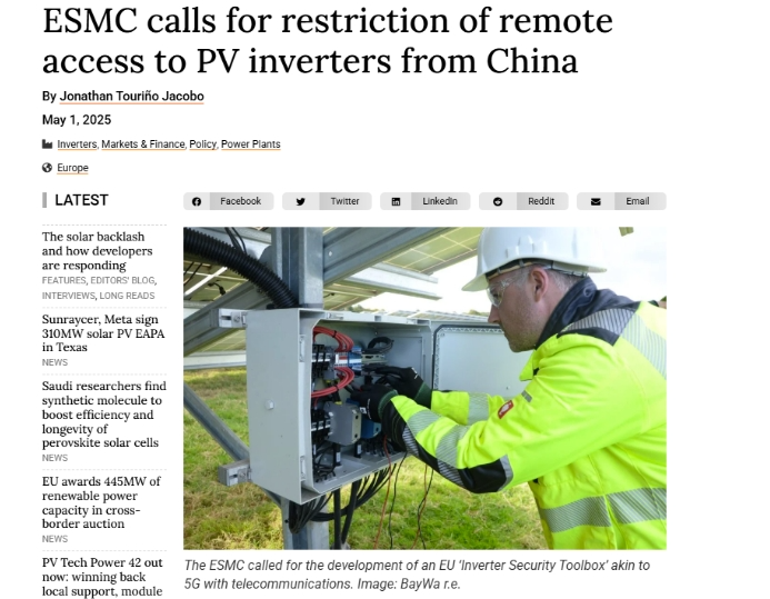 ESMC提議限制中國企業(yè)的太陽能逆變器遠程控制功能2025-05-09 14:03來源:gessey瀏覽數(shù):258次