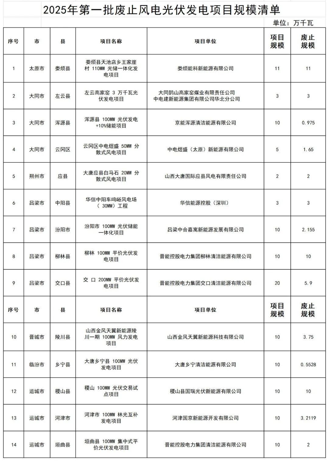 5月12日,山西省能源局關(guān)于公布2025年第一批廢止風(fēng)電光伏發(fā)電項目規(guī)模清單的通知,擬對婁煩縣天池店鄉(xiāng)王家崖村光儲一體化發(fā)電等14個項目、規(guī)模59.1947萬千瓦進行廢止。 其中,光伏廢止項目8個,規(guī)模達到35.6397萬千瓦;光儲一體化項目2個,規(guī)模13.155萬千瓦。 原文見下: 山西省能源局關(guān)于公布2025年第一批廢止風(fēng)電光伏發(fā)電項目規(guī)模清單的通知 晉能源新能源發(fā)〔2025〕102號 各市能源局,國網(wǎng)山西省電力公司、山西省地方電力有限公司: 為加快推進存量新能源項目建設(shè),優(yōu)化電網(wǎng)接入與資源配置,提高項目落地轉(zhuǎn)化率,根據(jù)《關(guān)于高質(zhì)量加快推進存量風(fēng)電光伏發(fā)電項目建設(shè)的通知》(晉能源新能源發(fā)〔2025〕69號),我局組織各市能源局對投資不積極、確定無法建設(shè)的存量風(fēng)電光伏發(fā)電項目進行了梳理。根據(jù)相關(guān)市上報的擬廢止、核減規(guī)模項目清單,經(jīng)我局匯總和公示,現(xiàn)對婁煩縣天池店鄉(xiāng)王家崖村光儲一體化發(fā)電等14個項目、總規(guī)模59.1947萬千瓦予以廢止。請相關(guān)市能源局按照有關(guān)政策規(guī)定,妥善處理廢止項目后續(xù)工作。 附件:2025年第一批廢止風(fēng)電光伏發(fā)電項目規(guī)模清單