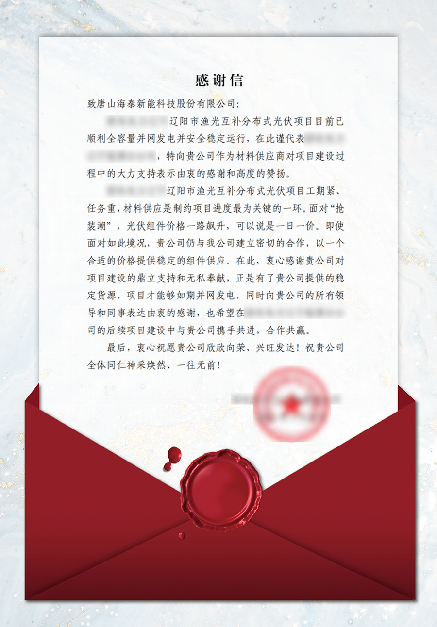 近期,基于海泰新能在遼陽市漁光互補分布式光伏項目中展現(xiàn)出的專業(yè)精神,業(yè)主單位致信感謝并予以高度贊許,期待保持緊密合作,攜手共贏。 該項目對組件供貨的及時性與質量有著極高要求,海泰新能不負眾望,建設期間全力以赴保障供貨,僅用38天完成從設計到并網(wǎng)的全流程,創(chuàng)下東北地區(qū)漂浮式光伏的新紀錄,這不僅展現(xiàn)了海泰新能生產(chǎn)供應能力,更體現(xiàn)了對客戶承諾的堅守。項目所選用的海泰新能0BB組件,具備高效發(fā)電、可靠耐用等優(yōu)勢,雙玻封裝工藝具有耐酸堿、耐鹽霧等性能,更能適合惡劣環(huán)境,組件長期保持高效輸出,降低運維成本。海泰新能憑借先進的技術能力與可靠的產(chǎn)品質量,為項目成功并網(wǎng)與高效運行提供了堅實保障 。 未來,海泰新能將與合作伙伴一起,砥礪奮進,率先作為,為當?shù)鼐G色發(fā)展注入強勁動能,共同譜寫能源建設新篇章。