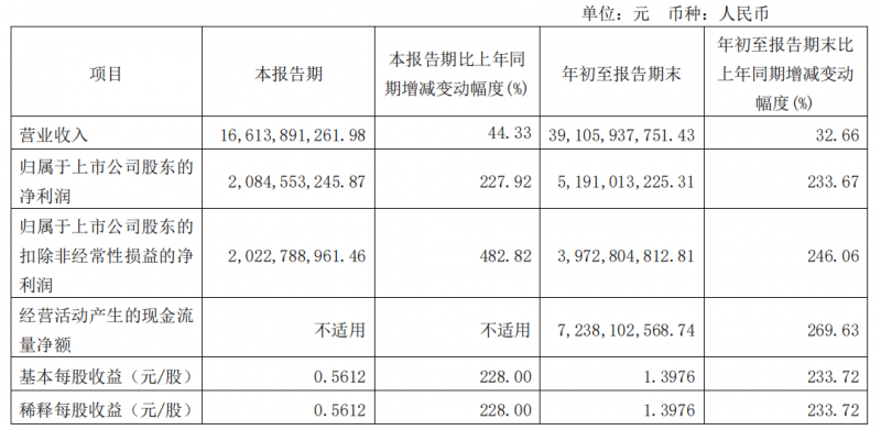 10月28日,特變電工發(fā)布2021 年第三季度報(bào)告。 報(bào)告顯示,第三季度公司實(shí)現(xiàn)營業(yè)收入16,613,891,261.98元,同比增長44.33%,歸屬于上市公司股東的凈利潤2,084,553,245.87元,同比增長227.92%,基本每股收益0.5612元/股,同比增長228%。 同時(shí),前三季度實(shí)現(xiàn)營業(yè)收入39,105,937,751.43元,同比增長32.66%,歸屬于上市公司股東的凈利潤5,191,013,225.31元,同比增長233.67%,基本每股收益1.3976元/股,同比增長233.72%。 報(bào)告稱,營業(yè)收入、凈利潤同比增長主要系投資的南網(wǎng)能源(003035.SZ)股票上市,公允價(jià)值變動收益增加、多晶硅價(jià)格上漲及銷量增加、新能源自營電站發(fā)電量增加、煤炭銷量增加等原因所致。