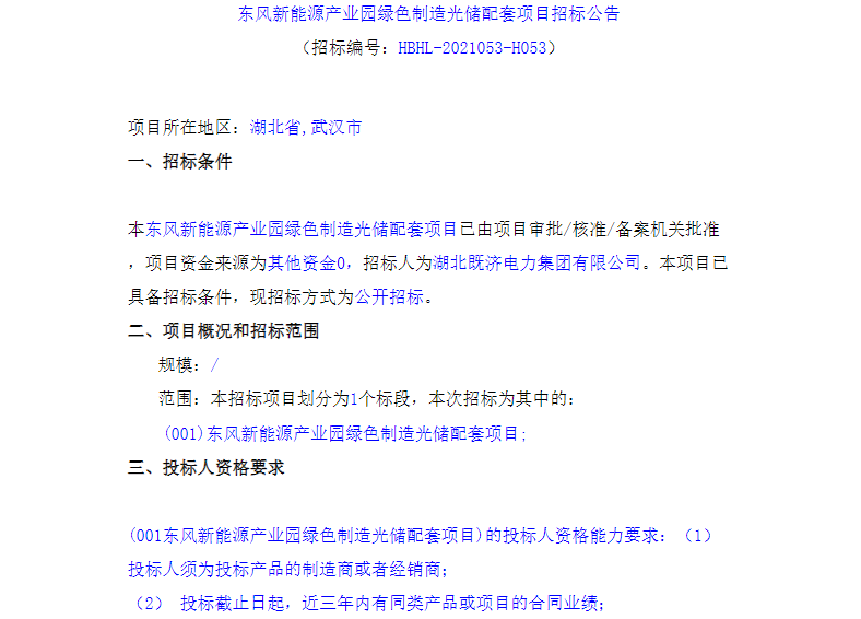 10月27日,湖北武漢東風新能源產(chǎn)業(yè)園綠色制造光儲配套項目發(fā)布招標公告,公告中顯示要求投標人近三年所提供的同類設備/材料未因該設備/材料質(zhì)量原因出現(xiàn)過事故,或出現(xiàn)討事故,舊己采取,有效的整改措施及善后處理,并得到驗證。