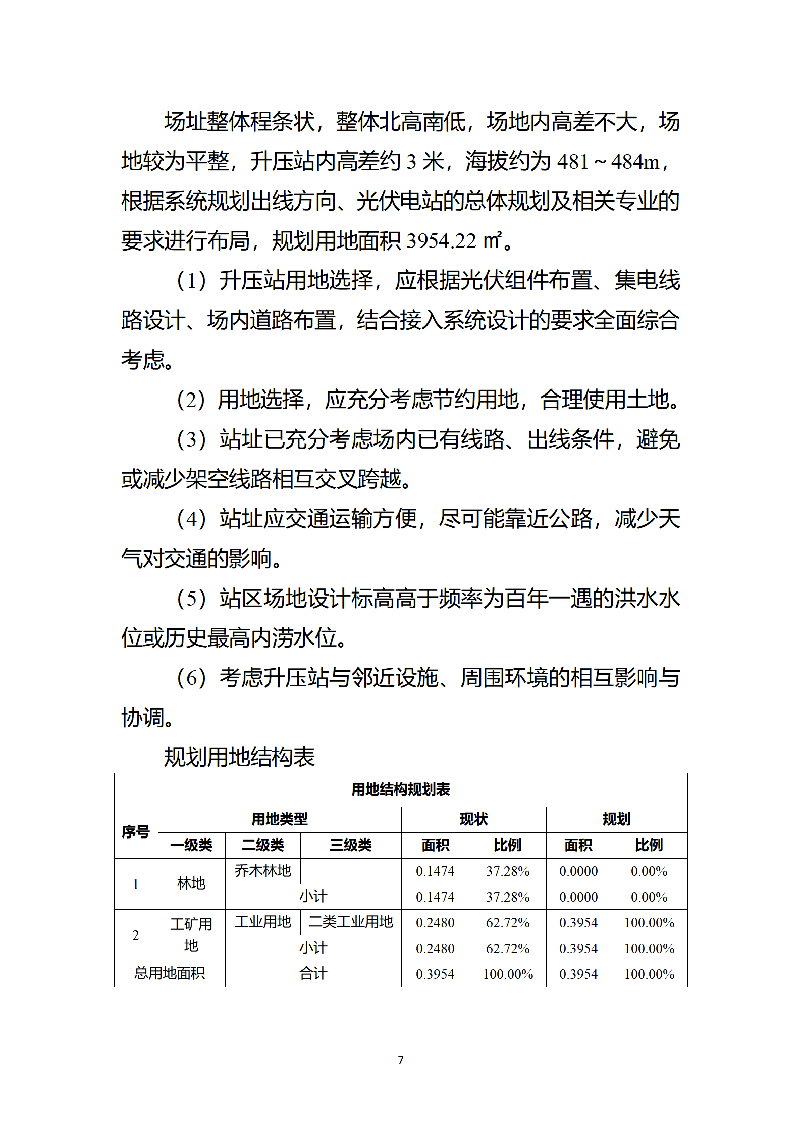 5月22日,云南省玉溪市元江縣人民政府公示了《元江縣那塘山光伏電站項目國土空間詳細規(guī)劃》,此次規(guī)劃范圍為3954.22平米,是光伏發(fā)電的變電站用地。 依據(jù)城市規(guī)劃原理,本次規(guī)劃將升壓站用地劃分為二類工業(yè)用地,用地代碼為100102。依據(jù)農(nóng)光互補光伏項目的工藝特性,由光伏板將光能轉(zhuǎn)換為電能,電能通過箱變轉(zhuǎn)換匯集到升壓站,升壓站升壓后入網(wǎng)。那么升壓站已布置在用地中部偏北的位置,便于兩側(cè)匯集,箱變宜與光伏區(qū)布置,整個項目用地將成串聯(lián)的用地布局形式。 升壓站場址整體程條狀,整體北高南低,場地內(nèi)高差不大,場地較為平整,升壓站內(nèi)高差約3米,海拔約為481~484m,根據(jù)系統(tǒng)規(guī)劃出線方向、光伏電站的總體規(guī)劃及相關專業(yè)的要求進行布局,規(guī)劃用地面積3954.22㎡。