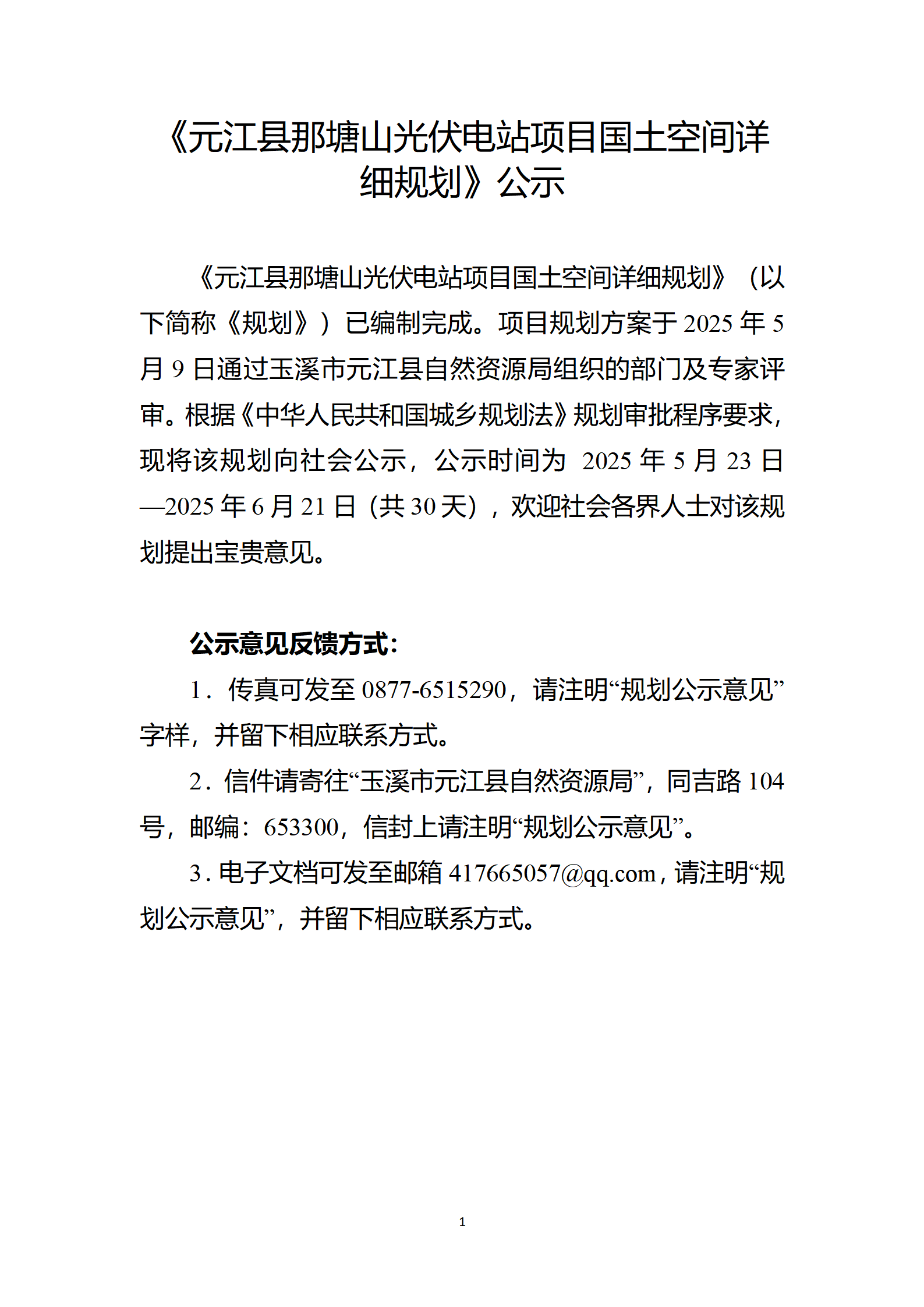詳情如下: 《元江縣那塘山光伏電站項目國土空間詳細規(guī)劃》公示 《元江縣那塘山光伏電站項目國土空間詳細規(guī)劃》(以下簡稱《規(guī)劃》)已編制完成。項目規(guī)劃方案于2025年5月9日通過玉溪市元江縣自然資源局組織的部門及專家評審。根據(jù)《中華人民共和國城鄉(xiāng)規(guī)劃法》規(guī)劃審批程序要求,現(xiàn)將該規(guī)劃向社會公示,公示時間為2025年5月23日—2025年6月21日(共30天),歡迎社會各界人士對該規(guī)劃提出寶貴意見。 公示意見反饋方式: 1.傳真可發(fā)至0877-6515290,請注明“規(guī)劃公示意見”字樣,并留下相應聯(lián)系方式。 2.信件請寄往“玉溪市元江縣自然資源局”,同吉路104號,郵編:653300,信封上請注明“規(guī)劃公示意見”。 3.電子文檔可發(fā)至郵箱417665057@qq.com,請注明“規(guī)劃公示意見”,并留下相應聯(lián)系方式。