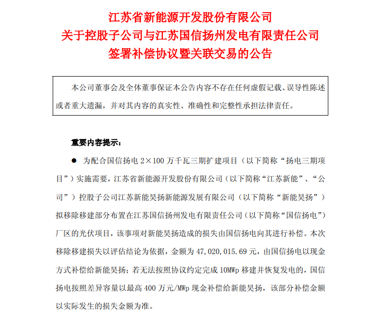 5月24日,江蘇新能發(fā)布公告,為配合國(guó)信揚(yáng)電2×100萬(wàn)千瓦三期擴(kuò)建項(xiàng)目(以下簡(jiǎn)稱“揚(yáng)電三期項(xiàng)目”)實(shí)施需要,公司控股子公司江蘇新能昊揚(yáng)新能源發(fā)展有限公司(以下簡(jiǎn)稱“新能昊揚(yáng)”)擬移除移建部分布置在江蘇國(guó)信揚(yáng)州發(fā)電有限責(zé)任公司(以下簡(jiǎn)稱“國(guó)信揚(yáng)電”)廠區(qū)的光伏項(xiàng)目。 本次移除移建損失以評(píng)估結(jié)論為依據(jù),金額為4702萬(wàn)元,由國(guó)信揚(yáng)電以現(xiàn)金方式補(bǔ)償給新能昊揚(yáng);若無(wú)法按照協(xié)議約定完成10MWp移建并恢復(fù)發(fā)電的,國(guó)信揚(yáng)電按照差異容量以最高400萬(wàn)元/MWp現(xiàn)金補(bǔ)償給新能昊揚(yáng),該部分補(bǔ)償金額以實(shí)際發(fā)生的損失金額為準(zhǔn)。