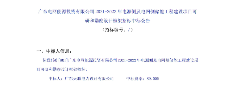 10月28日,廣東電網(wǎng)能源投資有限公司發(fā)布了2021-2022年電源側(cè)及電網(wǎng)側(cè)儲(chǔ)能工程建設(shè)項(xiàng)目可研和勘察設(shè)計(jì)框架招標(biāo)中標(biāo)公告。中標(biāo)人為廣東天聯(lián)電力設(shè)計(jì)有限公司,中標(biāo)費(fèi)率達(dá)89%。