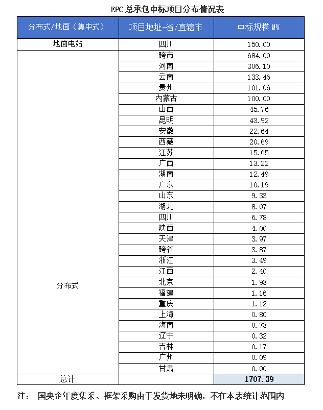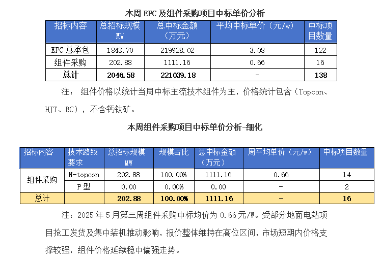 一、光伏項(xiàng)目招標(biāo)情況匯總: 根據(jù)Gessey蓋錫咨詢統(tǒng)計(jì),2025年5月17日-5月23日累計(jì)光伏招標(biāo)項(xiàng)目為144個(gè),項(xiàng)目規(guī)模合計(jì)為1046MW。光伏組件采購招標(biāo)項(xiàng)目為24個(gè),招標(biāo)規(guī)模為32.17MW,EPC總承包招標(biāo)項(xiàng)目為120個(gè),招標(biāo)規(guī)模為1013.84MW。 我們統(tǒng)計(jì)包含大型央企國企、地方能源集團(tuán)、地方政府機(jī)關(guān)、兩大電網(wǎng)、央企總包企業(yè)、知名光伏企業(yè)等,其中五大六小發(fā)電央企占總招標(biāo)規(guī)模較高,具體各企業(yè)排名如下表: 二、中標(biāo)項(xiàng)目分布類型匯總情況 本周中標(biāo)項(xiàng)目需求按照招標(biāo)場景地分布,分布式光伏主要集中在云南、江蘇、四川、江西等地區(qū),即主要集中在東南部地區(qū);集中式光伏主要集中在新疆、云南、寧夏、內(nèi)蒙古等地區(qū),即主要集中在西南部地區(qū)。 三、EPC總承包及組件采購情況匯總 本周光伏EPC總承包中標(biāo)規(guī)模達(dá)1843.7 MW,總中標(biāo)金額219928.02萬元,平均中標(biāo)單價(jià)為3.08元/W,中標(biāo)數(shù)量122個(gè)。 本周光伏組件采購中標(biāo)規(guī)模達(dá)202.88 MW,總中標(biāo)金額1111.16萬元,平均中標(biāo)單價(jià)為0.66元/W,中標(biāo)數(shù)量16個(gè)。