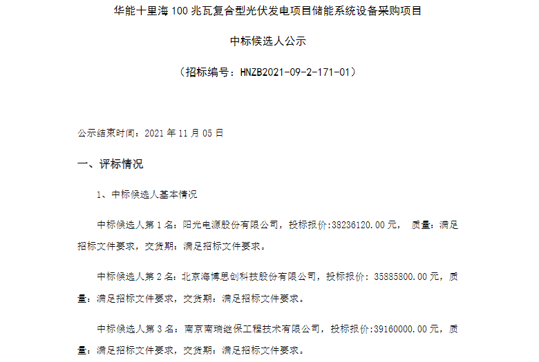 11月2日,華能十里海100兆瓦復(fù)合型光伏發(fā)電項目儲能系統(tǒng)設(shè)備采購預(yù)招標(biāo)發(fā)布候選人公示。 中標(biāo)候選人第1名:陽光電源股份有限公司,投標(biāo)報價:38236120元。 中標(biāo)候選人第2名:北京海博思創(chuàng)科技股份有限公司,投標(biāo)報價: 35885800元。 中標(biāo)候選人第3名:南京南瑞繼保工程技術(shù)有限公司,投標(biāo)報價:39160000元。