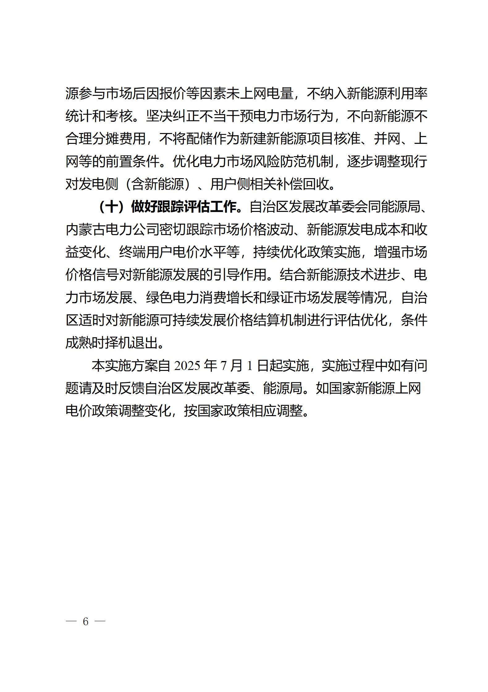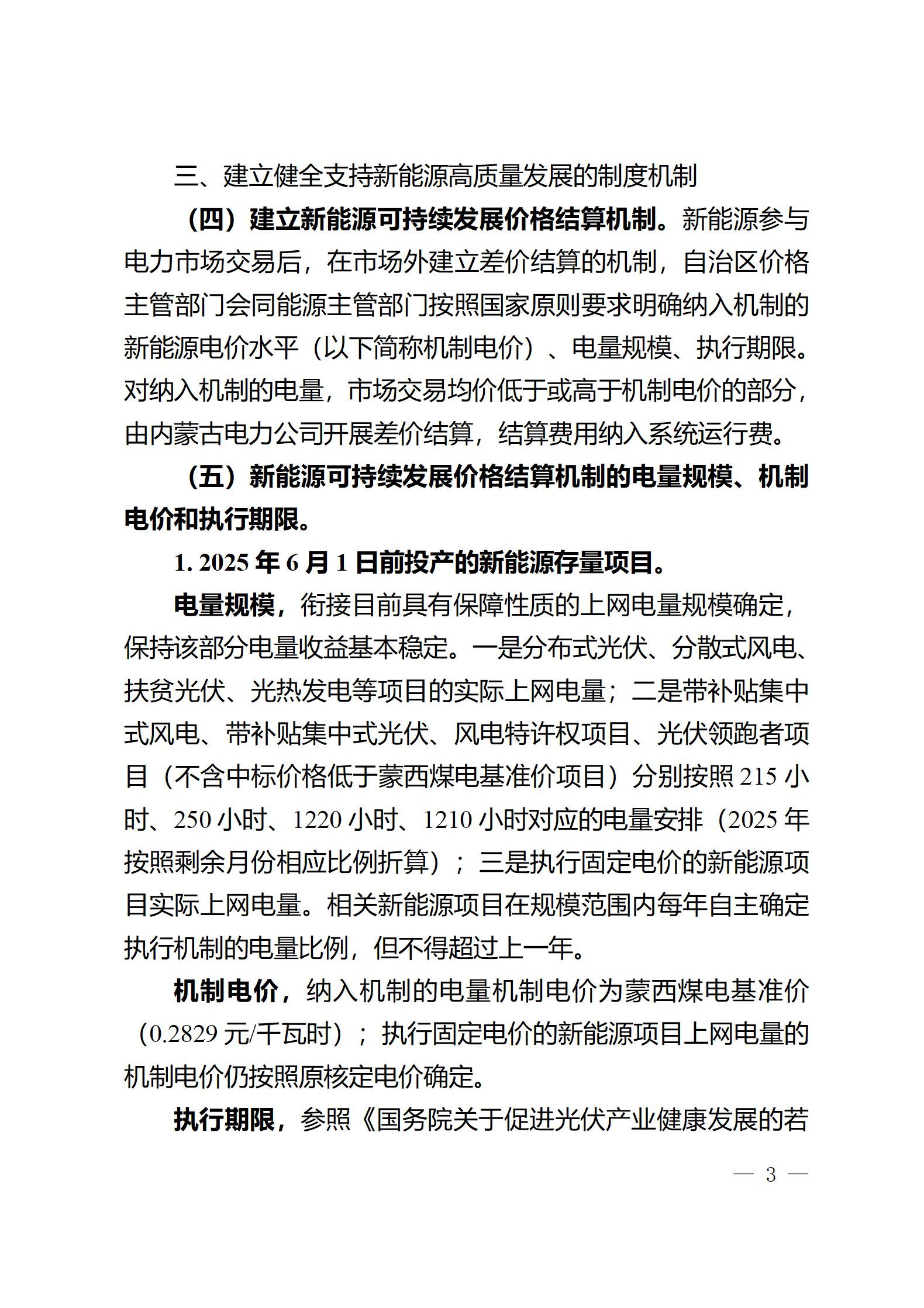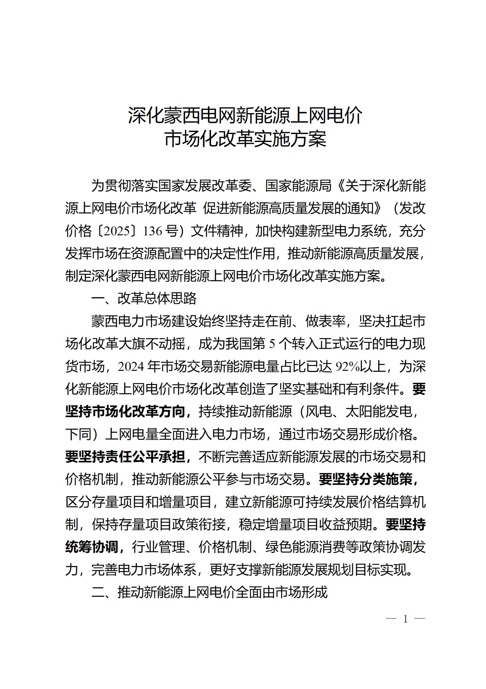 近日,內(nèi)蒙古自治區(qū)發(fā)展改革委、能源局印發(fā)關于《深化蒙西電網(wǎng)新能源上網(wǎng)電價市場化改革實施方案》的通知。 方案顯示,蒙西電力市場2024年市場交易新能源電量占比已達92%以上。 方案指出,推動新能源上網(wǎng)電價全面由市場形成。新能源項目上網(wǎng)電量全部進入電力市場。在集中式新能源項目上網(wǎng)電量已基本全部進入電力市場的基礎上,推動分布式光伏、分散式風電、扶貧光伏等新能源項目上網(wǎng)電量參與市場交易,實現(xiàn)新能源項目上網(wǎng)電量全部進入電力市場,上網(wǎng)電價通過市場交易形成。新能源項目可報量報價參與交易,也可接受市場形成的價格。鼓勵分布式、分散式新能源項目作為獨立的經(jīng)營主體參與市場,也可聚合后參與市場。未選擇直接參與市場交易或未聚合的項目,默認作為價格接受者。 完善現(xiàn)貨市場交易規(guī)則。完善現(xiàn)貨市場交易規(guī)則,推動新能源公平參與實時市場。現(xiàn)貨市場申報價格上限為1.5元/千瓦時;考慮新能源在電力市場外可獲得的其他收益等因素,申報價格下限暫按-0.05元/千瓦時執(zhí)行。后續(xù)結合市場價格運行實際,適時評估完善現(xiàn)貨市場申報限價。 2025年6月1日前投產(chǎn)的新能源存量項目 電量規(guī)模:銜接目前具有保障性質的上網(wǎng)電量規(guī)模確定,保持該部分電量收益基本穩(wěn)定。一是分布式光伏、分散式風電、扶貧光伏、光熱發(fā)電等項目的實際上網(wǎng)電量;二是帶補貼集中式風電、帶補貼集中式光伏、風電特許權項目、光伏領跑者項目(不含中標價格低于蒙西煤電基準價項目)分別按照215小時、250小時、1220小時、1210小時對應的電量安排(2025年按照剩余月份相應比例折算);三是執(zhí)行固定電價的新能源項目實際上網(wǎng)電量。相關新能源項目在規(guī)模范圍內(nèi)每年自主確定執(zhí)行機制的電量比例,但不得超過上一年。 機制電價:納入機制的電量機制電價為蒙西煤電基準價(0.2829元/千瓦時);執(zhí)行固定電價的新能源項目上網(wǎng)電量的機制電價仍按照原核定電價確定。 執(zhí)行期限:納入機制的項目達到全生命周期合理利用小時數(shù)或項目投產(chǎn)滿20年后,不再執(zhí)行機制電價。原國家批復文件中明確項目利用小時數(shù)或運行年限的,按照國家 要求執(zhí)行。 2025年6月1日后投產(chǎn)的新能源增量項目 為促進集中式、分布式(分散式)等各類新能源項目公平參與市場,進一步深化上網(wǎng)電價市場化改革,銜接現(xiàn)行電力交易政策,暫不安排新增納入機制的電量。后續(xù)根據(jù)年度非水電可再生能源電力消納責任權重完成情況,以及用戶承受能力等因素,結合電力市場運行實際及新能源項目收益等再行統(tǒng)籌考慮。 若后續(xù)年度安排納入機制的電量,可按年度組織已投產(chǎn)和未來12個月內(nèi)投產(chǎn)、且未納入過機制執(zhí)行范圍的項目自愿參與,通過競價形成,自治區(qū)價格主管部門會同能源主管部門明確機制電價競價上下限及執(zhí)行期限,委托內(nèi)蒙古電力公司制定具體競價規(guī)則并組織開展具體競價工作,競價規(guī)則應報自治區(qū)價格主管部門和能源主管部門備案。 新能源可持續(xù)發(fā)展價格結算機制的退出規(guī)則。納入機制的新能源項目在執(zhí)行期限內(nèi)可以自主向內(nèi)蒙古電力公司申請退出部分或全部納入機制的電量,自行參加市場。納入機制的新能源項目執(zhí)行到期后,內(nèi)蒙古電力公司組織做好審核退出,并提前告知企業(yè)。新能源項目執(zhí)行到期,或者在期限內(nèi)自愿退出的,均不再納入機制執(zhí)行范圍。 原文如下: 內(nèi)蒙古自治區(qū)發(fā)展改革委 能源局關于印發(fā)《深化蒙西電網(wǎng)新能源上網(wǎng)電價市場化改革實施方案》的通知 內(nèi)發(fā)改價費字〔2025〕660號 呼和浩特市、包頭市、錫林郭勒盟、鄂爾多斯市、烏蘭察布市、巴彥淖爾市、烏海市、阿拉善盟、二連浩特市發(fā)展改革委、能源局,內(nèi)蒙古電力(集團)有限責任公司,內(nèi)蒙古電力交易中心有限公司,各有關發(fā)電企業(yè): 為貫徹落實國家發(fā)展改革委、國家能源局《關于深化新能源上網(wǎng)電價市場化改革 促進新能源高質量發(fā)展的通知》(發(fā)改價格〔2025〕136號)文件精神,我們組織制定了《深化蒙西電網(wǎng)新能源上網(wǎng)電價市場化改革實施方案》,現(xiàn)印發(fā)給你們。請電網(wǎng)企業(yè)及電力交易機構認真做好組織落實,各盟市發(fā)展改革委、能源局要積極配合做好政策宣傳和解讀,密切跟蹤改革落實情況,重要情況及時報告自治區(qū)發(fā)展改革委、能源局。 特此通知。 附件:《深化蒙西電網(wǎng)新能源上網(wǎng)電價市場化改革實施方案》 內(nèi)蒙古自治區(qū)發(fā)展和改革委員會 內(nèi)蒙古自治區(qū)能源局 2025年5月29日