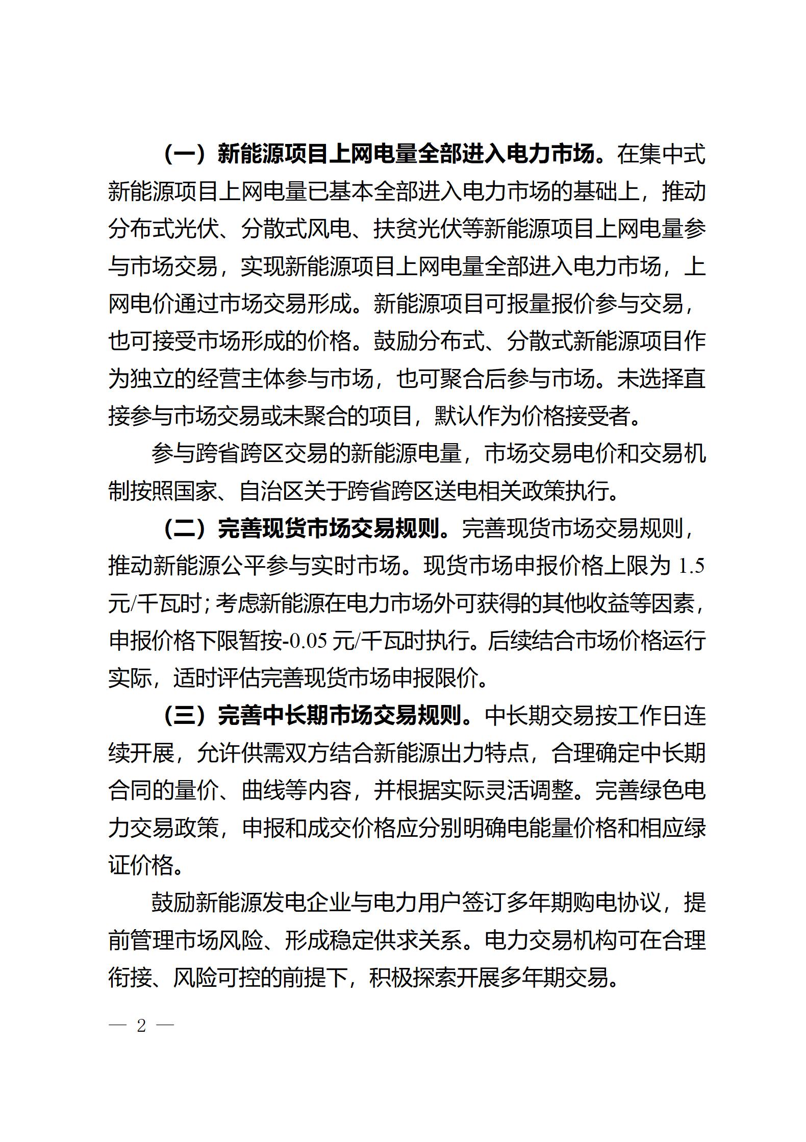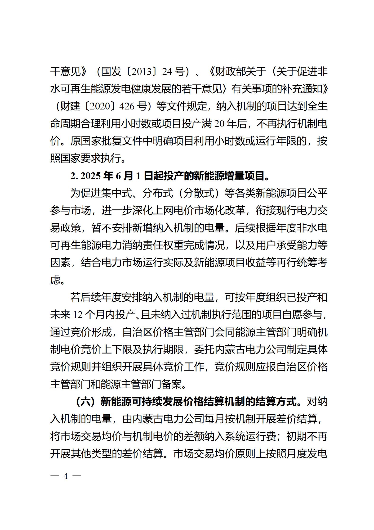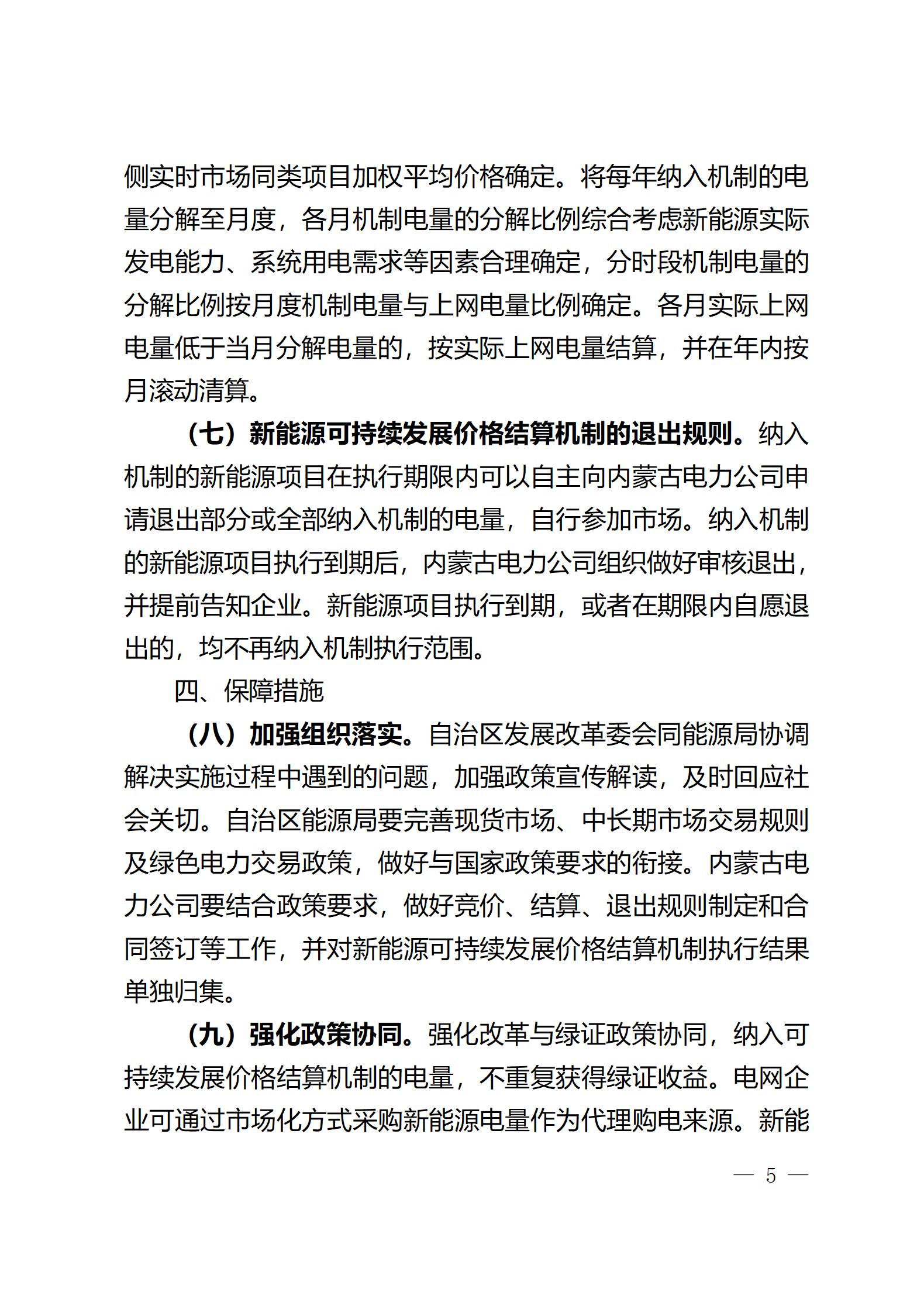 近日,內(nèi)蒙古自治區(qū)發(fā)展改革委、能源局印發(fā)關于《深化蒙西電網(wǎng)新能源上網(wǎng)電價市場化改革實施方案》的通知。 方案顯示,蒙西電力市場2024年市場交易新能源電量占比已達92%以上。 方案指出,推動新能源上網(wǎng)電價全面由市場形成。新能源項目上網(wǎng)電量全部進入電力市場。在集中式新能源項目上網(wǎng)電量已基本全部進入電力市場的基礎上,推動分布式光伏、分散式風電、扶貧光伏等新能源項目上網(wǎng)電量參與市場交易,實現(xiàn)新能源項目上網(wǎng)電量全部進入電力市場,上網(wǎng)電價通過市場交易形成。新能源項目可報量報價參與交易,也可接受市場形成的價格。鼓勵分布式、分散式新能源項目作為獨立的經(jīng)營主體參與市場,也可聚合后參與市場。未選擇直接參與市場交易或未聚合的項目,默認作為價格接受者。 完善現(xiàn)貨市場交易規(guī)則。完善現(xiàn)貨市場交易規(guī)則,推動新能源公平參與實時市場。現(xiàn)貨市場申報價格上限為1.5元/千瓦時;考慮新能源在電力市場外可獲得的其他收益等因素,申報價格下限暫按-0.05元/千瓦時執(zhí)行。后續(xù)結合市場價格運行實際,適時評估完善現(xiàn)貨市場申報限價。 2025年6月1日前投產(chǎn)的新能源存量項目 電量規(guī)模:銜接目前具有保障性質的上網(wǎng)電量規(guī)模確定,保持該部分電量收益基本穩(wěn)定。一是分布式光伏、分散式風電、扶貧光伏、光熱發(fā)電等項目的實際上網(wǎng)電量;二是帶補貼集中式風電、帶補貼集中式光伏、風電特許權項目、光伏領跑者項目(不含中標價格低于蒙西煤電基準價項目)分別按照215小時、250小時、1220小時、1210小時對應的電量安排(2025年按照剩余月份相應比例折算);三是執(zhí)行固定電價的新能源項目實際上網(wǎng)電量。相關新能源項目在規(guī)模范圍內(nèi)每年自主確定執(zhí)行機制的電量比例,但不得超過上一年。 機制電價:納入機制的電量機制電價為蒙西煤電基準價(0.2829元/千瓦時);執(zhí)行固定電價的新能源項目上網(wǎng)電量的機制電價仍按照原核定電價確定。 執(zhí)行期限:納入機制的項目達到全生命周期合理利用小時數(shù)或項目投產(chǎn)滿20年后,不再執(zhí)行機制電價。原國家批復文件中明確項目利用小時數(shù)或運行年限的,按照國家 要求執(zhí)行。 2025年6月1日后投產(chǎn)的新能源增量項目 為促進集中式、分布式(分散式)等各類新能源項目公平參與市場,進一步深化上網(wǎng)電價市場化改革,銜接現(xiàn)行電力交易政策,暫不安排新增納入機制的電量。后續(xù)根據(jù)年度非水電可再生能源電力消納責任權重完成情況,以及用戶承受能力等因素,結合電力市場運行實際及新能源項目收益等再行統(tǒng)籌考慮。 若后續(xù)年度安排納入機制的電量,可按年度組織已投產(chǎn)和未來12個月內(nèi)投產(chǎn)、且未納入過機制執(zhí)行范圍的項目自愿參與,通過競價形成,自治區(qū)價格主管部門會同能源主管部門明確機制電價競價上下限及執(zhí)行期限,委托內(nèi)蒙古電力公司制定具體競價規(guī)則并組織開展具體競價工作,競價規(guī)則應報自治區(qū)價格主管部門和能源主管部門備案。 新能源可持續(xù)發(fā)展價格結算機制的退出規(guī)則。納入機制的新能源項目在執(zhí)行期限內(nèi)可以自主向內(nèi)蒙古電力公司申請退出部分或全部納入機制的電量,自行參加市場。納入機制的新能源項目執(zhí)行到期后,內(nèi)蒙古電力公司組織做好審核退出,并提前告知企業(yè)。新能源項目執(zhí)行到期,或者在期限內(nèi)自愿退出的,均不再納入機制執(zhí)行范圍。 原文如下: 內(nèi)蒙古自治區(qū)發(fā)展改革委 能源局關于印發(fā)《深化蒙西電網(wǎng)新能源上網(wǎng)電價市場化改革實施方案》的通知 內(nèi)發(fā)改價費字〔2025〕660號 呼和浩特市、包頭市、錫林郭勒盟、鄂爾多斯市、烏蘭察布市、巴彥淖爾市、烏海市、阿拉善盟、二連浩特市發(fā)展改革委、能源局,內(nèi)蒙古電力(集團)有限責任公司,內(nèi)蒙古電力交易中心有限公司,各有關發(fā)電企業(yè): 為貫徹落實國家發(fā)展改革委、國家能源局《關于深化新能源上網(wǎng)電價市場化改革 促進新能源高質量發(fā)展的通知》(發(fā)改價格〔2025〕136號)文件精神,我們組織制定了《深化蒙西電網(wǎng)新能源上網(wǎng)電價市場化改革實施方案》,現(xiàn)印發(fā)給你們。請電網(wǎng)企業(yè)及電力交易機構認真做好組織落實,各盟市發(fā)展改革委、能源局要積極配合做好政策宣傳和解讀,密切跟蹤改革落實情況,重要情況及時報告自治區(qū)發(fā)展改革委、能源局。 特此通知。 附件:《深化蒙西電網(wǎng)新能源上網(wǎng)電價市場化改革實施方案》 內(nèi)蒙古自治區(qū)發(fā)展和改革委員會 內(nèi)蒙古自治區(qū)能源局 2025年5月29日