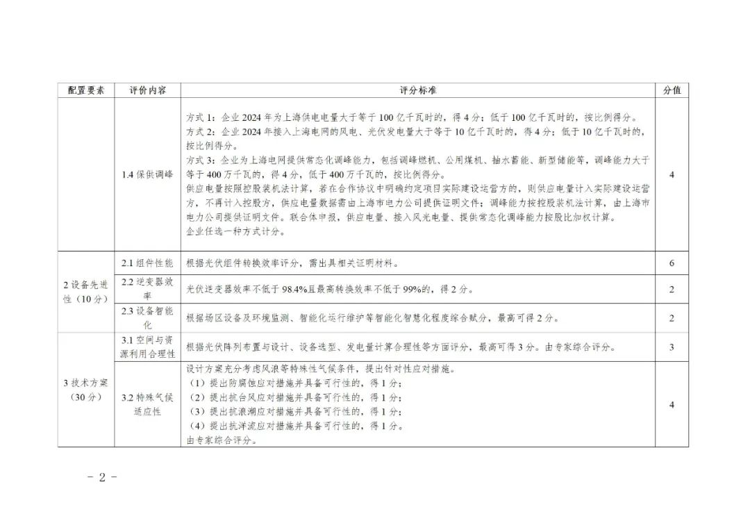 本次通知明確,項目實施程序包括發(fā)布公告、報名申請、編制并遞交報名材料、專家評審,以及公布結(jié)果,有意向參與競爭配置的企業(yè)向服務單位進行報名并領取項目競爭配置工作文件,申報企業(yè)可以單獨申報,也可以組成聯(lián)合體申報,聯(lián)合體申報須明確牽頭企業(yè)。 申報企業(yè)在獲得項目開發(fā)權后一個月內(nèi)向市發(fā)展改革委報送項目股權方案,牽頭企業(yè)股比不低于1/2、不高于2/3。支持牽頭企業(yè)引入有能力的能源開發(fā)、裝備、施工、設計等企業(yè)參股,支持民營企業(yè)參與項目開發(fā)。 關于上網(wǎng)電價,通知明確,機制電價由上海發(fā)改委組織海上光伏項目自愿參與競價形成。本輪競爭配置排名前二的海上光伏項目,單個項目申報機制電量占全年發(fā)電量比例上限按90%執(zhí)行;其余海上光伏項目,單個項目申報機制電量比例上限取70%和當年度我市新能源上網(wǎng)電價市場化改革機制相關政策規(guī)定上限的低值,具體按照我市新能源增量項目競價工作方案執(zhí)行。 申報企業(yè)應承諾獲得項目開發(fā)權后9個月內(nèi)開工、1年半內(nèi)全容量并網(wǎng)。場址位于涉界海域的項目,承諾開工并網(wǎng)進度要求可適當延后,延后期限最長不超過1年。 項目并網(wǎng)時間每逾期一個季度(不足一個季度按一個季度計),申報機制電量占全年發(fā)電量比例上限扣減10個百分點。若項目主要建設內(nèi)容未按實施方案執(zhí)行或項目并網(wǎng)時間逾期一年以上的,市發(fā)展改革委可依據(jù)《上海市可再生能源項目競爭配置管理辦法》取消投資主體的開發(fā)資格,由下一順位的投資主體接替或重新開展項目競爭配置工作。 從項目競爭配置評分來看,上網(wǎng)電價占比40分、技術方案30分、企業(yè)能力20分、設備先進性10分,具體見下: