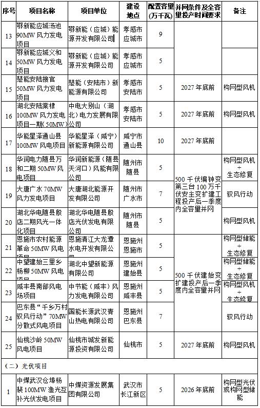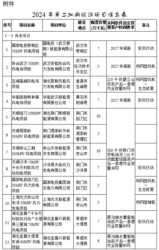 7月7日,湖北省能源局公布了《湖北省2024年第二批新能源發(fā)電項(xiàng)目名單》,此次公布的新能源項(xiàng)目共32個,容量187.812萬千瓦。其中:風(fēng)電項(xiàng)目25個,裝機(jī)容量157萬千瓦;光伏發(fā)電項(xiàng)目7個,裝機(jī)容量30.812萬千瓦。 詳情如下: 省能源局關(guān)于公布2024年第二批新能源發(fā)電項(xiàng)目名單的通知 各有關(guān)市(州)發(fā)改委(能源局),國網(wǎng)湖北省電力有限公司: 根據(jù)《省能源局關(guān)于開展2024年常規(guī)新能源發(fā)電項(xiàng)目競爭性配置的通知》(鄂能源新能〔2024〕61號)、《省能源局關(guān)于2024年度政策性配置新能源開發(fā)建設(shè)規(guī)模的通知》(鄂能源新能〔2024〕63號)和《省發(fā)改委 省能源局關(guān)于印發(fā)“千鄉(xiāng)萬村馭風(fēng)行動”工作方案的通知》(鄂發(fā)改能源〔2024〕336號),現(xiàn)將第二批通過各級發(fā)改(能源)主管部門審核和國網(wǎng)湖北省電力有限公司接網(wǎng)校核的新能源發(fā)電項(xiàng)目予以公布。 一、此次公布的新能源項(xiàng)目共32個,容量187.312萬千瓦。其中:風(fēng)電項(xiàng)目25個,裝機(jī)容量157萬千瓦;光伏發(fā)電項(xiàng)目7個,裝機(jī)容量31.812萬千瓦。具體名單詳見附件。 二、各有關(guān)市(縣)能源主管部門要指導(dǎo)項(xiàng)目單位進(jìn)一步落實(shí)建設(shè)條件,依法依規(guī)辦理相關(guān)手續(xù)。協(xié)調(diào)有關(guān)部門強(qiáng)化用地、用林等要素保障,及時解決項(xiàng)目推進(jìn)中遇到的困難和問題,為項(xiàng)目建設(shè)創(chuàng)造良好條件。 三、各項(xiàng)目單位要科學(xué)安排項(xiàng)目建設(shè)時序,嚴(yán)格落實(shí)主體責(zé)任,加強(qiáng)項(xiàng)目建設(shè)安全管理,依法合規(guī)推進(jìn)項(xiàng)目建設(shè),確保按要求、按承諾建成投運(yùn)。項(xiàng)目建成投運(yùn)后,要及時完成建檔立卡工作。 四、請國網(wǎng)湖北省電力有限公司及時辦理電網(wǎng)接入方案批復(fù),加快相關(guān)電網(wǎng)工程建設(shè),支持項(xiàng)目盡早并網(wǎng)。 附件:2024年第二批新能源項(xiàng)目信息表 湖北省能源局 2025年6月24日