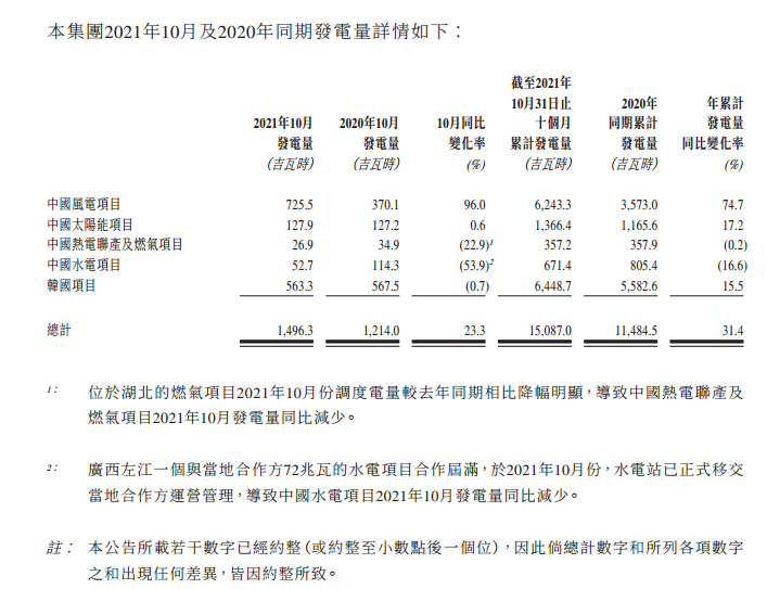 截至2021年10月31日止10個(gè)月,該集團(tuán)累計(jì)完成發(fā)電量15087吉瓦時(shí),比2020年同期增加31.4%。其中,中國(guó)風(fēng)電項(xiàng)目增加74.7%,中國(guó)太陽(yáng)能項(xiàng)目增加17.2%,中國(guó)熱電聯(lián)產(chǎn)及燃?xì)忭?xiàng)目減少0.2%,中國(guó)水電項(xiàng)目減少16.6%及韓國(guó)項(xiàng)目增加15.5%。