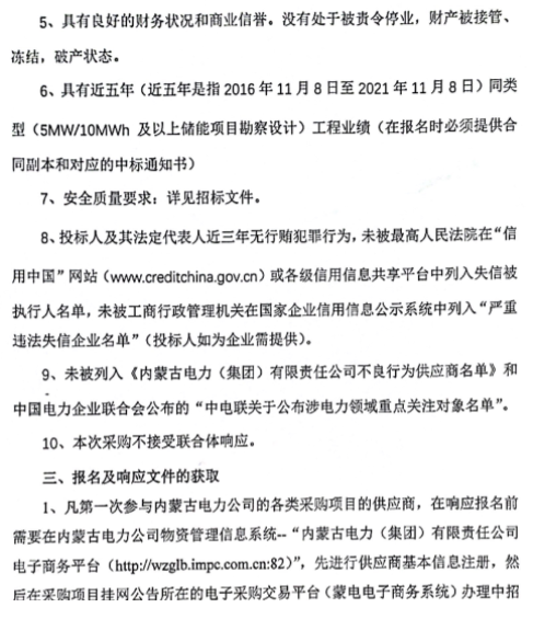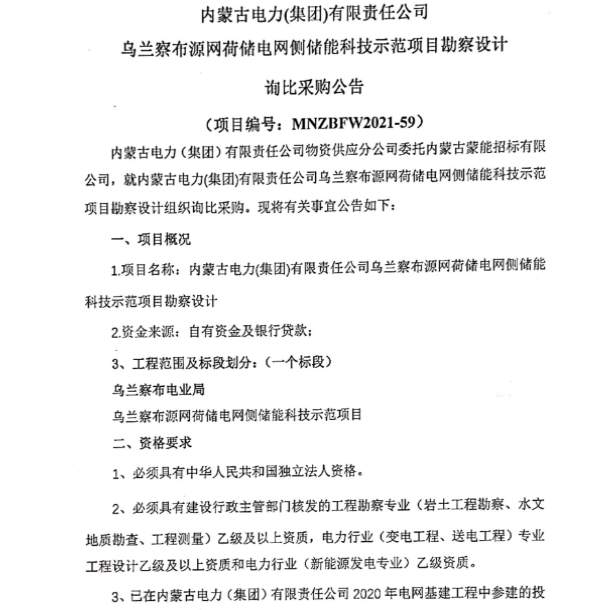 11月8日內(nèi)蒙古電力(集團(tuán))有限責(zé)任公司發(fā)布烏蘭察布源網(wǎng)荷儲電網(wǎng)側(cè)儲能科技示范項(xiàng)目勘察設(shè)計(jì)詢比采購招標(biāo)公告,公告中提出要求投標(biāo)人具有近五年(2016年11月8日至2021年11月8日)同類型(5MW/10MWh及以上儲能項(xiàng)目勘察設(shè)計(jì))工程業(yè)績。