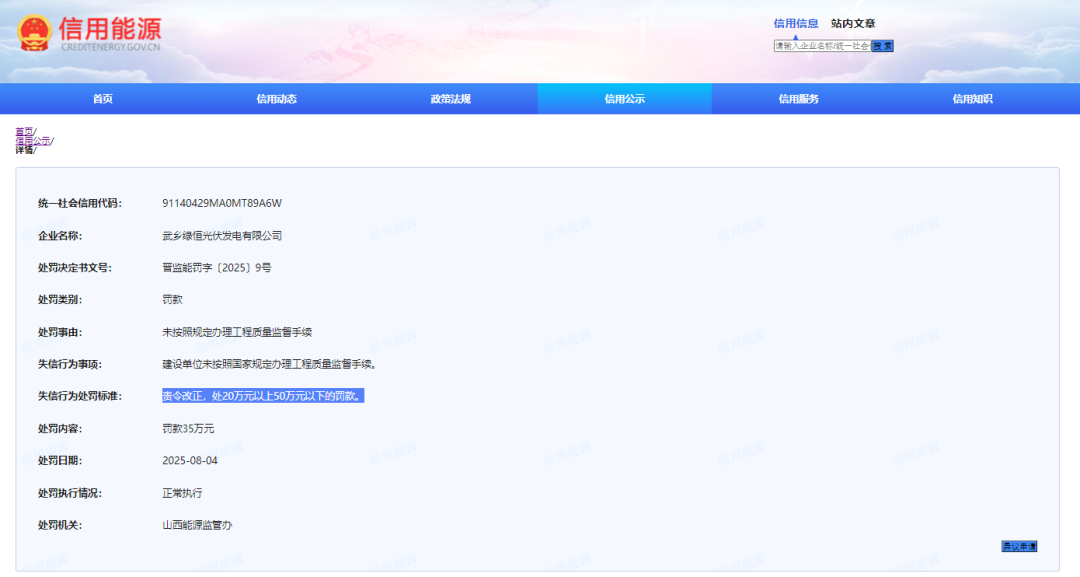 武鄉(xiāng)綠恒光伏發(fā)電有限公司因未按照規(guī)定辦理工程質(zhì)量監(jiān)督手續(xù),被山西能源監(jiān)管辦責(zé)令改正,處20萬元以上50萬元以下的罰款。