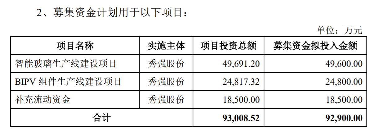 11月11日,珠海港發(fā)布公告,其持股 25.02%的控股子公司江蘇秀強(qiáng)擬向特定對象發(fā)行不超過185,451,726股(含185,451,726股)A 股股票,且募集資金總額不超過 92,900.00萬元,用于智能玻璃生產(chǎn)線建設(shè)項(xiàng)目、BIPV 組件生產(chǎn)線建設(shè)項(xiàng)目以及補(bǔ)充流動資金。 珠海港擬以現(xiàn)金方式按照本次發(fā)行前公司持有秀強(qiáng)股份的股份比例進(jìn)行同比例認(rèn)購,最終認(rèn)購股票數(shù)量及金額根據(jù)秀強(qiáng)股份實(shí)際發(fā)行數(shù)量和發(fā)行價格確定,認(rèn)購金額預(yù)計(jì)約 23,500.00萬元,并擬與秀強(qiáng)股份簽署《附條件生效的向特定對象發(fā)行股份認(rèn)購協(xié)議》及出具相關(guān)承諾。 上述事項(xiàng)已經(jīng)公司于2021年11月11日召開的第十屆董事局第十八次2會議審議通過,參與表決的董事9人,同意9人;反對0人,棄權(quán)0人。 據(jù)了解,若實(shí)際募集資金凈額少于上述項(xiàng)目擬投入的募集資金總額,秀強(qiáng)股份將根據(jù)實(shí)際募集資金凈額,按照項(xiàng)目的輕重緩急等情況,調(diào)整并最終決定募集資金的具體投資項(xiàng)目、優(yōu)先順序及各項(xiàng)目的具體投資額,募集資金不足部分由秀強(qiáng)股份以自有資金或通過其他融資方式解決。 項(xiàng)目建成后秀強(qiáng)股份將可實(shí)現(xiàn)年產(chǎn)500MW的BIPV組件以及年產(chǎn)各 類智能玻璃430萬片的生產(chǎn)能力,經(jīng)測算,BIPV組件生產(chǎn)線建設(shè)項(xiàng)目投資財(cái)務(wù)內(nèi)部收益率為21.39%(所得稅后),投資回收期為6.56年(稅后, 含建設(shè)期 2 年);智能玻璃生產(chǎn)線建設(shè)項(xiàng)目投資財(cái)務(wù)內(nèi)部收益率為 14.03% (所得稅后),投資回收期為 7.62 年(稅后,含建設(shè)期 2 年)。