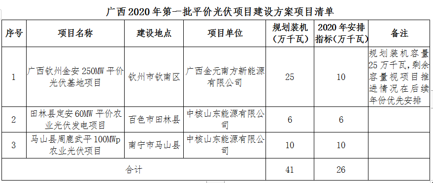 11月27日,廣西省能源局發(fā)布《關(guān)于印發(fā)2020年平價(jià)風(fēng)電和第一批平價(jià)光伏項(xiàng)目建設(shè)方案的通知》,《通知》指出,列入2020年第一批平價(jià)光伏項(xiàng)目建設(shè)方案項(xiàng)目共3個(gè),裝機(jī)容量26萬(wàn)千瓦。 《通知》要求:列入建設(shè)方案的項(xiàng)目要抓緊開(kāi)展前期工作。光伏項(xiàng)目在本方案印發(fā)之日起6個(gè)月內(nèi)實(shí)現(xiàn)開(kāi)工建設(shè),2021年底前全容量并網(wǎng),未按期開(kāi)工建設(shè)或未按期實(shí)現(xiàn)全容量并網(wǎng)的我局將收回未建成部分的建設(shè)指標(biāo)。 原文如下: 廣西壯族自治區(qū)能源局關(guān)于印發(fā)2020年平價(jià)風(fēng)電和第一批平價(jià)光伏項(xiàng)目建設(shè)方案的通知 桂能新能〔2020〕29號(hào) 有關(guān)市發(fā)展改革委,廣西電網(wǎng)有限責(zé)任公司、有關(guān)項(xiàng)目單位: 根據(jù)《國(guó)家能源局關(guān)于2020年風(fēng)電、光伏發(fā)電項(xiàng)目建設(shè)有關(guān)事項(xiàng)的通知》(國(guó)能發(fā)新能〔2020〕17號(hào))要求,我局根據(jù)競(jìng)爭(zhēng)性配置評(píng)分結(jié)果及廣西電網(wǎng)有限責(zé)任公司消納意見(jiàn),統(tǒng)籌制定了2020年平價(jià)風(fēng)電和第一批平價(jià)光伏項(xiàng)目建設(shè)方案,現(xiàn)印發(fā)給你們,并就有關(guān)事項(xiàng)通知如下: 一、列入2020年平價(jià)風(fēng)電項(xiàng)目建設(shè)方案項(xiàng)目共8個(gè),裝機(jī)容量約80萬(wàn)千瓦;列入2020年第一批平價(jià)光伏項(xiàng)目建設(shè)方案項(xiàng)目共3個(gè),裝機(jī)容量26萬(wàn)千瓦。具體項(xiàng)目詳見(jiàn)附件。 二、列入建設(shè)方案的項(xiàng)目要抓緊開(kāi)展前期工作。風(fēng)電項(xiàng)目自本方案印發(fā)之日起6個(gè)月內(nèi)完成項(xiàng)目核準(zhǔn)前置手續(xù),向核準(zhǔn)機(jī)關(guān)申報(bào)核準(zhǔn),未按期申報(bào)核準(zhǔn)的項(xiàng)目一律調(diào)出本建設(shè)方案。光伏項(xiàng)目在本方案印發(fā)之日起6個(gè)月內(nèi)實(shí)現(xiàn)開(kāi)工建設(shè),2021年底前全容量并網(wǎng),未按期開(kāi)工建設(shè)或未按期實(shí)現(xiàn)全容量并網(wǎng)的我局將收回未建成部分的建設(shè)指標(biāo)。 三、各項(xiàng)目單位需服從電網(wǎng)調(diào)度和并網(wǎng)安排,合理推進(jìn)項(xiàng)目建設(shè)和并網(wǎng)工作。 四、請(qǐng)各項(xiàng)目單位深入排查自然保護(hù)區(qū)、飲用水源保護(hù)區(qū)、公益林、生態(tài)紅線等顛覆性因素,若涉及生態(tài)紅線等敏感因素導(dǎo)致項(xiàng)目調(diào)出本建設(shè)方案的,風(fēng)險(xiǎn)由項(xiàng)目單位自行承擔(dān)。 五、請(qǐng)有關(guān)市發(fā)展改革委進(jìn)一步做好轄區(qū)內(nèi)風(fēng)電、光伏項(xiàng)目開(kāi)發(fā)建設(shè)管理工作,指導(dǎo)項(xiàng)目單位開(kāi)展前期工作。 六、未經(jīng)我局同意,項(xiàng)目建成投產(chǎn)前不得擅自進(jìn)行轉(zhuǎn)讓、項(xiàng)目業(yè)主變更、建設(shè)地點(diǎn)變更等。如有此類行為,一經(jīng)查實(shí),將依法撤銷該項(xiàng)目的核準(zhǔn)文件或收回建設(shè)指標(biāo)。 特此通知。 廣西壯族自治區(qū)能源局 2020年11月26日