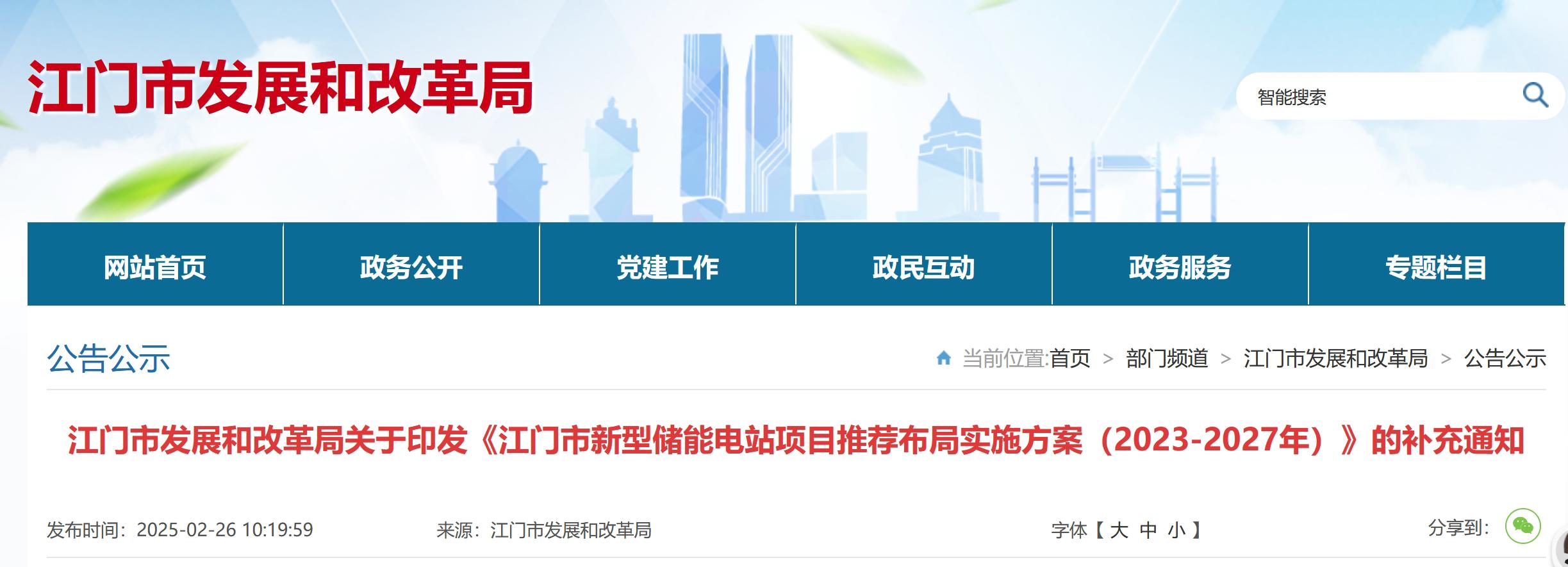 各縣(市、區(qū))人民政府,市有關(guān)單位,各有關(guān)企業(yè): 2023年7月,我局印發(fā)了《江門市新型儲(chǔ)能電站項(xiàng)目推薦布局實(shí)施方案(2023-2027年)》(以下簡(jiǎn)稱《實(shí)施方案》),對(duì)獨(dú)立儲(chǔ)能電站單點(diǎn)接入容量進(jìn)行了建議,其中負(fù)荷中心地區(qū)獨(dú)立儲(chǔ)能電站單點(diǎn)接入容量建議5-10萬千瓦,新能源富集地區(qū)獨(dú)立儲(chǔ)能電站單點(diǎn)接入容量建議3-15萬千瓦。 隨著新型電力系統(tǒng)的逐步構(gòu)建,新能源接入比例逐步提高,為做好新形勢(shì)下新能源消納工作,加強(qiáng)電力系統(tǒng)調(diào)節(jié)能力建設(shè),結(jié)合工作推進(jìn)實(shí)際,并經(jīng)市人民政府同意,現(xiàn)對(duì)《實(shí)施方案》補(bǔ)充通知如下: 一、獨(dú)立儲(chǔ)能電站項(xiàng)目接入容量可根據(jù)新能源發(fā)展需要、電網(wǎng)接入條件適當(dāng)調(diào)整 新型儲(chǔ)能電站項(xiàng)目建設(shè)前應(yīng)做好規(guī)劃選址、建設(shè)條件論證和市場(chǎng)需求分析等工作。各縣(市、區(qū))發(fā)展改革局會(huì)同供電部門加強(qiáng)研究,結(jié)合新能源發(fā)展、電網(wǎng)接入條件等實(shí)際情況,可對(duì)《實(shí)施方案》中儲(chǔ)能電站接入容量適當(dāng)調(diào)整,建議單點(diǎn)接入容量不大于25萬千瓦。確需對(duì)《實(shí)施方案》中儲(chǔ)能電站接入容量進(jìn)行調(diào)整的,在開展競(jìng)爭(zhēng)性配置前,應(yīng)取得供電部門的同意接入意見,并將有關(guān)調(diào)整情況向市發(fā)展改革局、江門供電局報(bào)備。已完成競(jìng)爭(zhēng)性配置的存量項(xiàng)目,確需調(diào)整單點(diǎn)接入容量的,經(jīng)屬地縣(市、區(qū))人民政府批準(zhǔn)同意后,由屬地相關(guān)單位辦理有關(guān)手續(xù),并向市發(fā)展改革局報(bào)備。 二、獨(dú)立儲(chǔ)能電站項(xiàng)目執(zhí)行年度建設(shè)計(jì)劃制度,并滾動(dòng)調(diào)整 獨(dú)立儲(chǔ)能電站項(xiàng)目需納入年度建設(shè)計(jì)劃方可建設(shè)。納入年度建設(shè)計(jì)劃的項(xiàng)目需承諾在年內(nèi)動(dòng)工,加快建設(shè)并按計(jì)劃投產(chǎn),如無法按時(shí)動(dòng)工建設(shè)投產(chǎn)的,需及時(shí)上報(bào)申請(qǐng)調(diào)出年度建設(shè)計(jì)劃。納入年度建設(shè)計(jì)劃(未申請(qǐng)調(diào)出),而又未按時(shí)動(dòng)工建設(shè)、投產(chǎn)的項(xiàng)目,將不得納入第二年的新型儲(chǔ)能電站項(xiàng)目年度建設(shè)計(jì)劃。 三、已投運(yùn)新型儲(chǔ)能電站項(xiàng)目明確消防責(zé)任、在建項(xiàng)目主動(dòng)報(bào)備 已投入使用的新型儲(chǔ)能電站項(xiàng)目要依據(jù)廣東省消防安全重點(diǎn)單位界定標(biāo)準(zhǔn),符合條件的單位需列為屬地消防安全重點(diǎn)單位,明確消防安全管理責(zé)任,強(qiáng)化消防設(shè)施建設(shè)、應(yīng)急預(yù)案、消防監(jiān)督檢查等工作。在建項(xiàng)目要主動(dòng)向?qū)俚叵谰仍箨?duì)報(bào)備,依據(jù)按照國家相關(guān)規(guī)定、標(biāo)準(zhǔn)開展建設(shè),確保儲(chǔ)能電站項(xiàng)目在設(shè)計(jì)、建設(shè)過程中符合消防安全標(biāo)準(zhǔn),有效預(yù)防和減少火災(zāi)事故的發(fā)生。 江門市發(fā)展和改革局 2025年2月25日