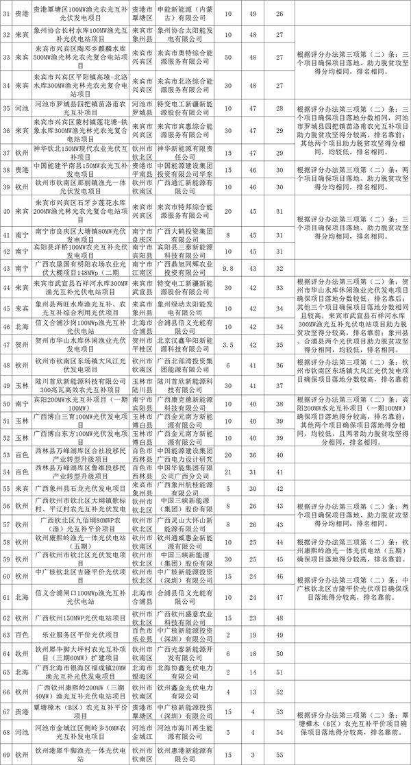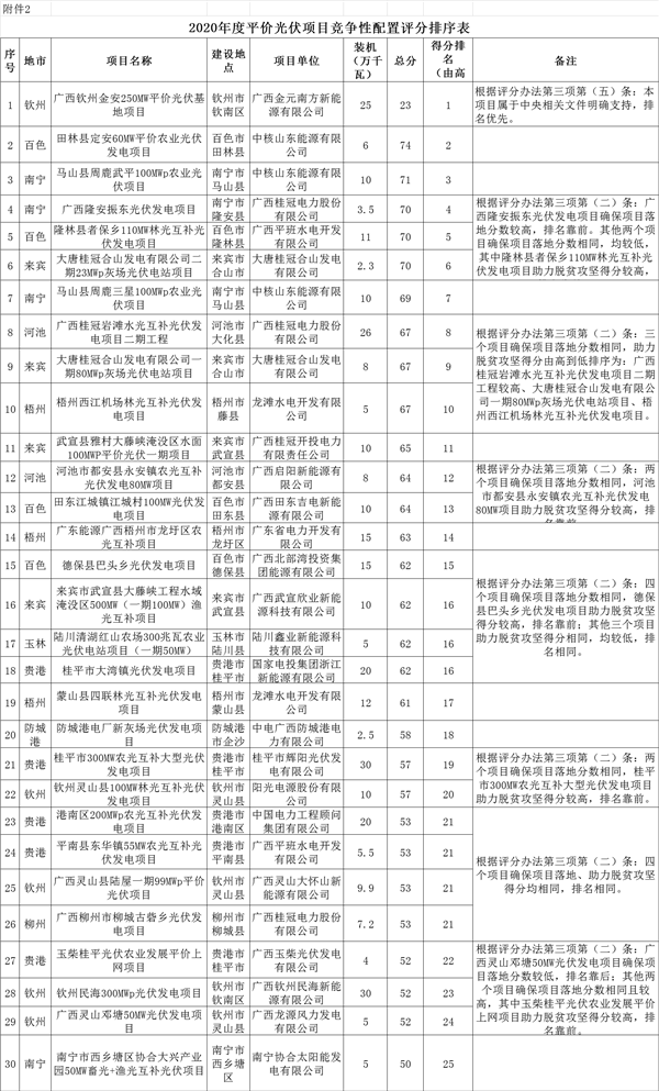 近日,廣西發(fā)改委官網(wǎng)發(fā)布了《關(guān)于2020年度平價風電、競價和平價光伏項目競爭性配置評分結(jié)果的公示》,其中光伏競價項目49個,裝機量1140.085MW;光伏平價項目69個,裝機量8792MW;風電平價項目67個,裝機量6531.1MW。 詳情如下: 關(guān)于2020年度平價風電、競價和平價光伏項目競爭性配置評分結(jié)果的公示 根據(jù)《國家能源局關(guān)于2020年風電、光伏發(fā)電項目建設(shè)有關(guān)事項的通知》(國能發(fā)新能〔2020〕17號)要求, 為建設(shè)清潔低碳、安全高效的能源體系,實現(xiàn)風電、光伏發(fā)電高質(zhì)量發(fā)展,我委委托第三方機構(gòu)開展2020年度平價風電、競價和平價光伏項目競爭性配置評分工作。本次各市上報的平價風電項目共67個,競價光伏項目共49個,平價光伏項目共69個。第三方機構(gòu)按照《廣西2020年度無補貼平價風電項目競爭性配置評分辦法》《廣西2020年度競價、平價光伏項目競爭性配置評分辦法》對滿足《廣西壯族自治區(qū)發(fā)展和改革委員會關(guān)于報送我區(qū)2020年風電光伏發(fā)電項目的通知》(桂發(fā)改新能〔2020〕345號)要求的每個項目進行綜合評定和排序,現(xiàn)將評分結(jié)果予以公示。如有異議,請在公示發(fā)布之日起5日內(nèi)向我委反映(信函以到達日期郵戳為準)。公示期:2020年6月5日-10日聯(lián)系方式: 0771-2328553、2328556、2328842(傳真)郵寄地址: 廣西南寧市民族大道111-1號郵 編: 5300011.競價光伏項目清單及評分情況2.平價光伏項目清單及評分情況3.平價風電項目清單及評分情況4.廣西2020年度無補貼平價風電項目競爭性配置評分辦法5.廣西2020年度無補貼平價風電項目競爭性配置評分辦法 廣西壯族自治區(qū)發(fā)展和改革委員會 2020年6月5日