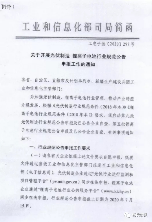 近日,工信部發(fā)布 工電子函〔2020〕297號(hào)《關(guān)于開展光伏制造 鋰離子電池行業(yè)規(guī)范公告申報(bào)工作的通知》,啟動(dòng)第九批光伏制造行業(yè)規(guī)范公告申報(bào)及已公告企業(yè)自查!