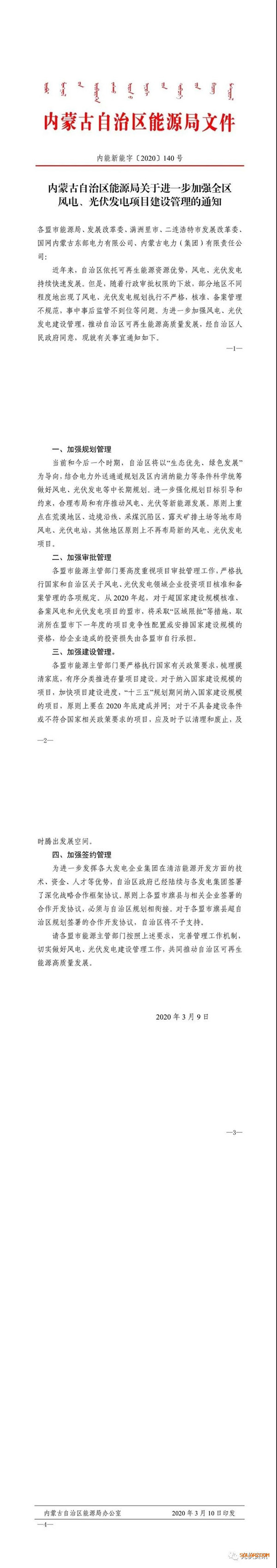 3月18日,內(nèi)蒙古自治區(qū)官網(wǎng)發(fā)布《內(nèi)蒙古自治區(qū)能源局關(guān)于進一步加強全區(qū)風電、光伏發(fā)電項目建設(shè)管理的通知》,內(nèi)蒙古能源局進一步收權(quán),主要要點有: 1、原則上重點在荒漠地區(qū)、邊境沿線、采煤沉陷區(qū)、露天礦排土場等地布局風電、光伏電站,其他地區(qū)原則上不再布局新的風電、光伏發(fā)電項目。 2、從2020年起,對于超國家建設(shè)規(guī)模核準、備案風電和光伏發(fā)電項目的盟市,將采取“區(qū)域限批”等措施,取消所在盟市下一年度的項目競爭性配置或安排國家建設(shè)規(guī)模的資格,給企業(yè)造成的投資損失由各盟市自行承擔。 3、“十三五”規(guī)劃期間納入國家建設(shè)規(guī)模的項目,原則上要在2020年底建成并網(wǎng);對于不具備建設(shè)條件或不符合國家相關(guān)政策要求的項目,應(yīng)及時予以清理和廢止。 4、自治區(qū)政府已經(jīng)陸續(xù)與各發(fā)電集團簽署了深化戰(zhàn)略合作框架協(xié)議。原則上各盟市旗縣與相關(guān)企業(yè)簽署的合作開發(fā)協(xié)議,必須與自治區(qū)規(guī)劃相銜接。對于各盟市旗縣超自治區(qū)規(guī)劃簽署的合作開發(fā)協(xié)議,自治區(qū)將不予支持。 內(nèi)蒙古自治區(qū)能源局關(guān)于進一步加強全區(qū)風電、光伏發(fā)電項目建設(shè)管理的通知 內(nèi)能新能字〔2020〕140號