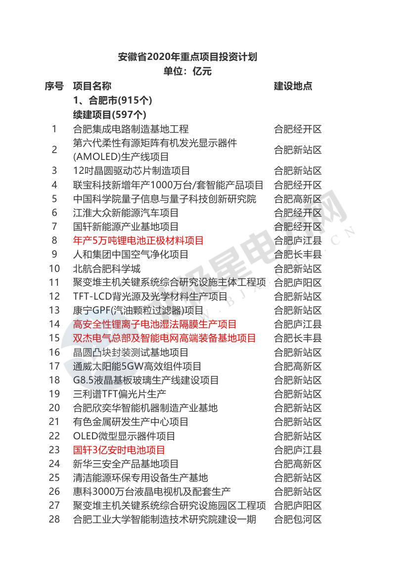 近日,安徽省發(fā)布2020年重點(diǎn)項(xiàng)目名單,共6878個(gè)項(xiàng)目上榜,較去年增長(zhǎng)13.4%,全年計(jì)劃投資13054.6億元。其中,續(xù)建項(xiàng)目4295個(gè),計(jì)劃開工項(xiàng)目2583個(gè),涉及鋰電池、風(fēng)電場(chǎng)、太陽能光伏、抽水蓄能、生活垃圾焚燒發(fā)電、新能源汽車、充電樁、熱電聯(lián)產(chǎn)等多個(gè)能源、儲(chǔ)能等多個(gè)方面。 據(jù)了解,重點(diǎn)項(xiàng)目投資計(jì)劃主要呈現(xiàn)四個(gè)方面的特點(diǎn):一是圍繞加快高質(zhì)量發(fā)展,著力謀劃推進(jìn)先進(jìn)制造業(yè)項(xiàng)目。戰(zhàn)略性新興產(chǎn)業(yè)、傳統(tǒng)產(chǎn)業(yè)升級(jí)改造等制造業(yè)項(xiàng)目共計(jì)3063個(gè),年度計(jì)劃投資4267.1億元,占比分別為44.5%、32.7%。二是圍繞基礎(chǔ)設(shè)施補(bǔ)短板,著力謀劃推進(jìn)交通、水利、能源等基礎(chǔ)設(shè)施項(xiàng)目。納入計(jì)劃項(xiàng)目992個(gè),年度計(jì)劃投資2691.0億元。同時(shí),積極謀劃推進(jìn)5G基建、大數(shù)據(jù)中心等新型基礎(chǔ)設(shè)施領(lǐng)域項(xiàng)目。三是圍繞打造生態(tài)文明建設(shè)安徽樣板,著力謀劃推進(jìn)生態(tài)環(huán)保建設(shè)項(xiàng)目。納入計(jì)劃項(xiàng)目數(shù)和年度計(jì)劃投資同比分別增長(zhǎng)11.6%、15.2%。四是圍繞保障和改善民生,著力謀劃推進(jìn)社會(huì)事業(yè)、民生工程項(xiàng)目。納入計(jì)劃項(xiàng)目數(shù)和年度計(jì)劃投資同比分別增長(zhǎng)30.9%、40.7%。 據(jù)北極星太陽能光伏網(wǎng)統(tǒng)計(jì),本次安徽重點(diǎn)項(xiàng)目包括通威太陽能5GW高效組件項(xiàng)目、智慧光伏系統(tǒng)制造基地與新能源數(shù)據(jù)運(yùn)營(yíng)中心等18個(gè)光伏項(xiàng)目。