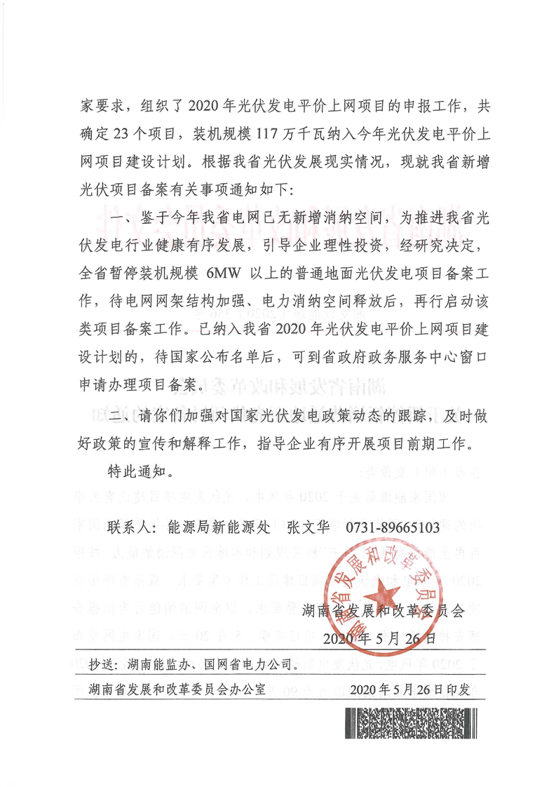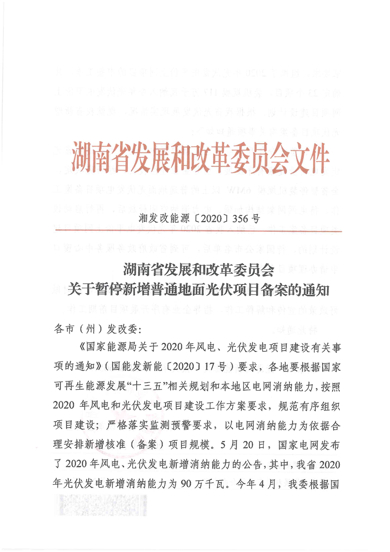 5月26日,北極星太陽(yáng)能光伏網(wǎng)從彬州市發(fā)改委官網(wǎng)獲悉,湖南今日發(fā)布《關(guān)于暫停新增普通地面光伏項(xiàng)目備案的通知》。 文件明確指出,全省暫停裝機(jī)規(guī)模6MW以上的普通地面光伏電站項(xiàng)目的備案工作,待電網(wǎng)網(wǎng)架架構(gòu)加強(qiáng)、電力消納空間釋放后,再行啟動(dòng)該類項(xiàng)目備案工作。 這也是首個(gè)省級(jí)層面的地方政府發(fā)文暫停光伏電站項(xiàng)目備案!