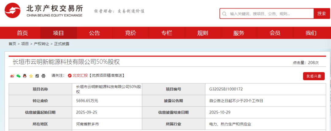 據(jù)北京產(chǎn)權(quán)交易所披露,2025年9月25日,中國三峽新能源(集團(tuán))股份有限公司掛牌轉(zhuǎn)讓長垣市云明新能源科技有限公司50%股權(quán),轉(zhuǎn)讓底價(jià)5696.65萬元。