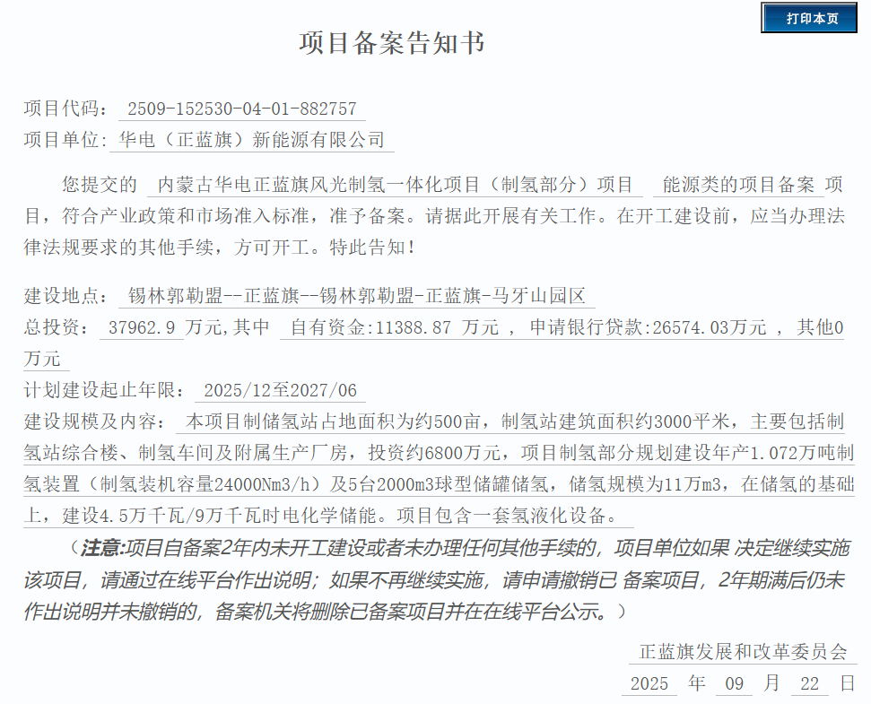 內(nèi)蒙古華電正藍(lán)旗風(fēng)光制氫一體化項(xiàng)目獲批!2025-09-26 16:06瀏覽數(shù):173次