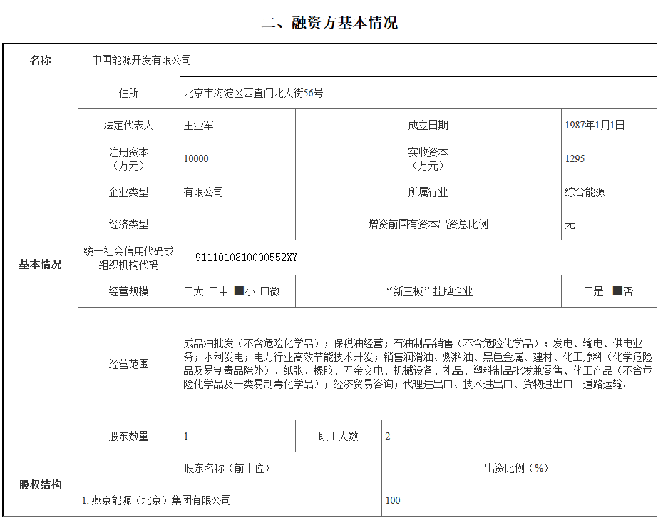 9月23日,北京產(chǎn)權(quán)交易所發(fā)布中國(guó)能源開發(fā)有限公司增資項(xiàng)目信息。中國(guó)能源開發(fā)有限公司擬增資1億元開展與加油站、加氫站、充電站(樁)、成品油集采、新能源開發(fā)相關(guān)的項(xiàng)目。 公告顯示,本次募集金額對(duì)應(yīng)持股比例50%或商議。