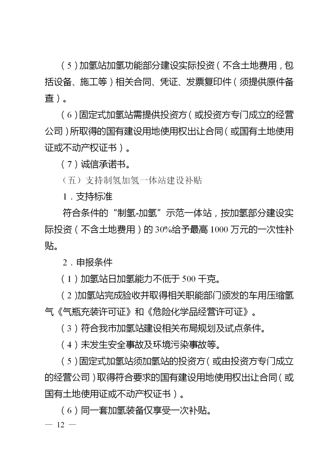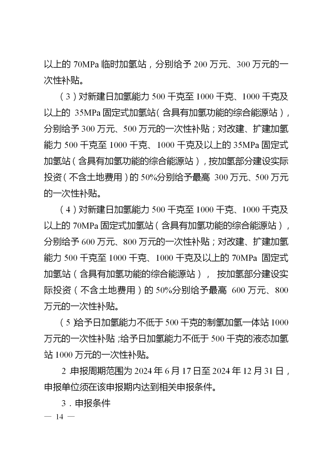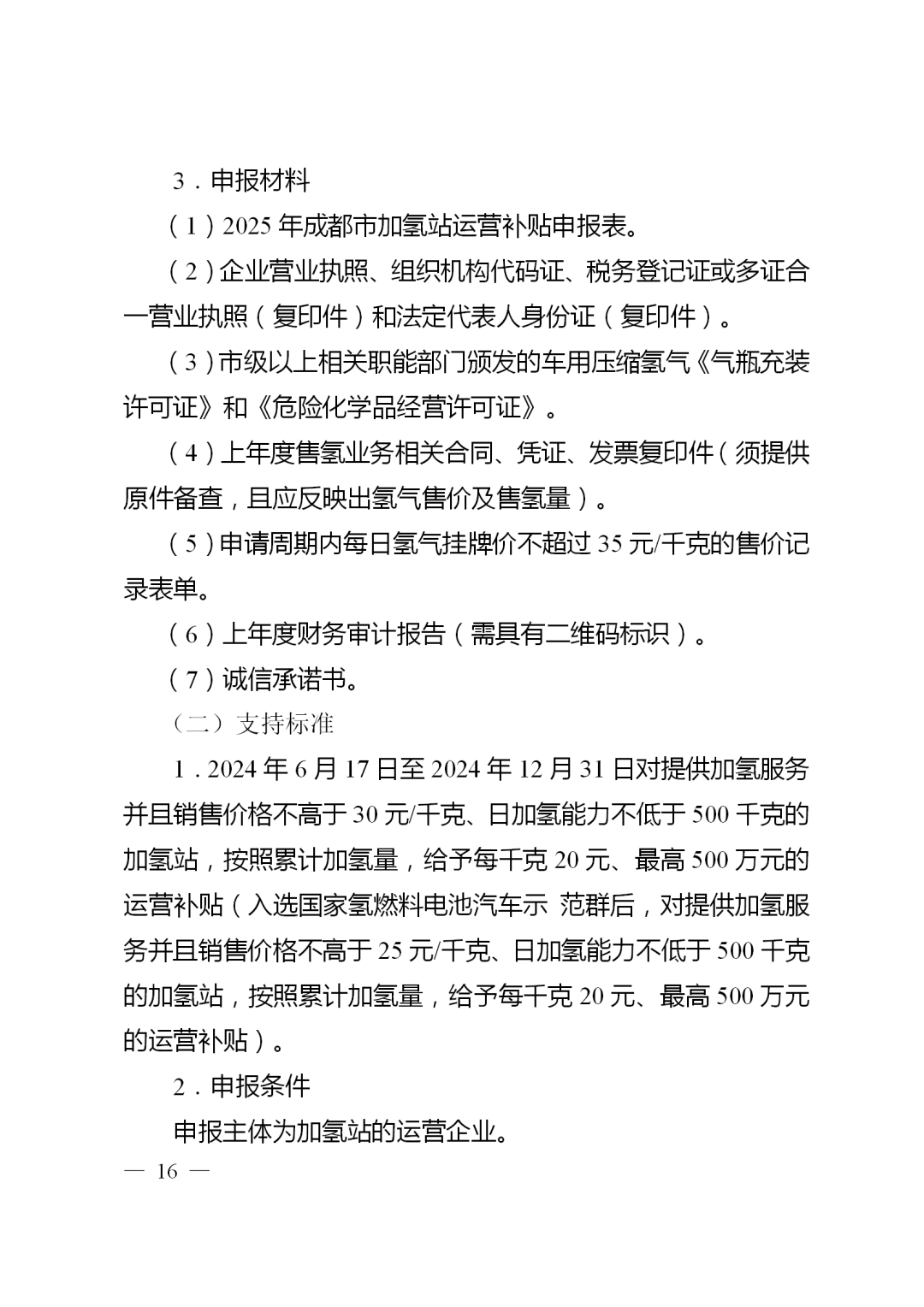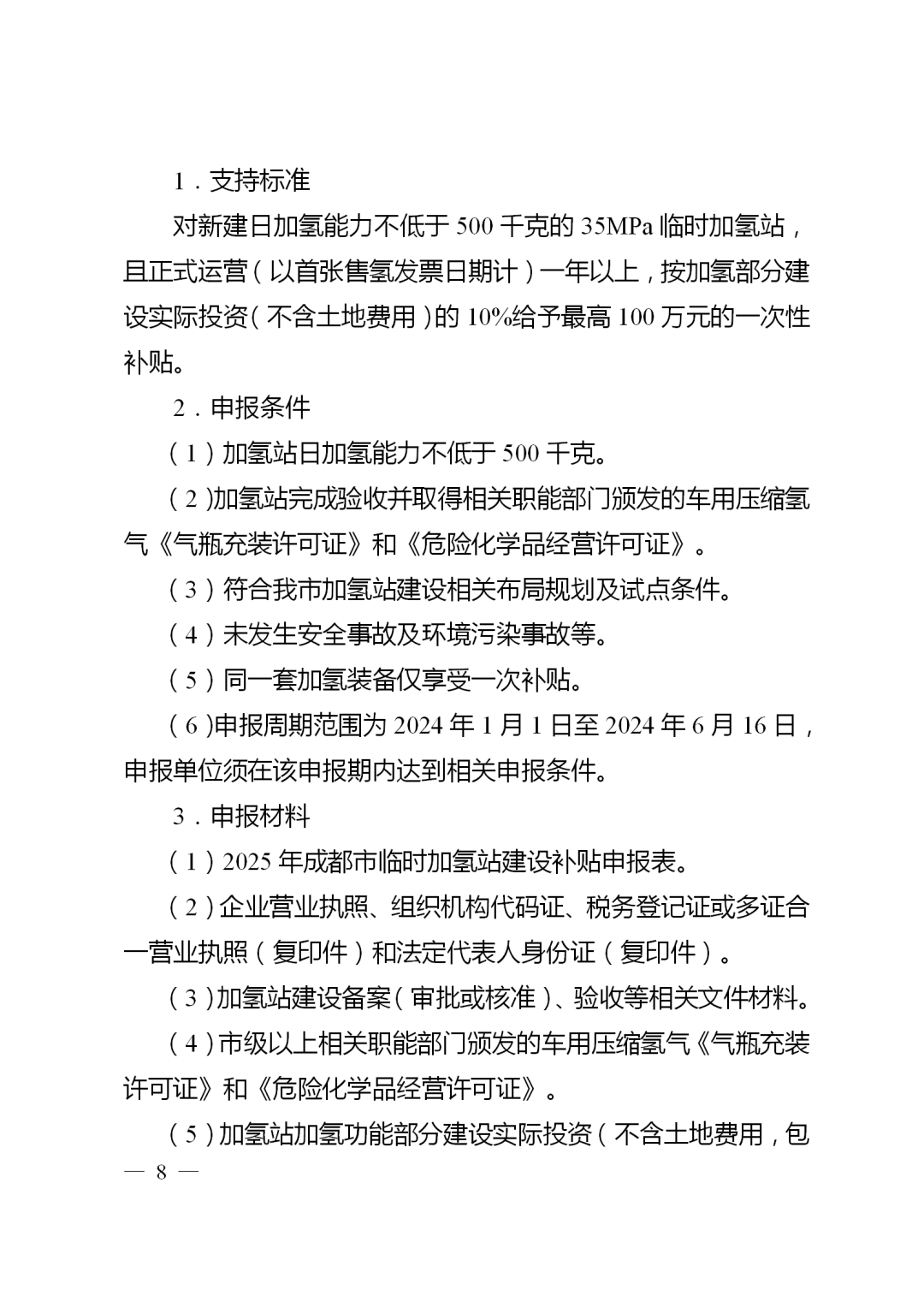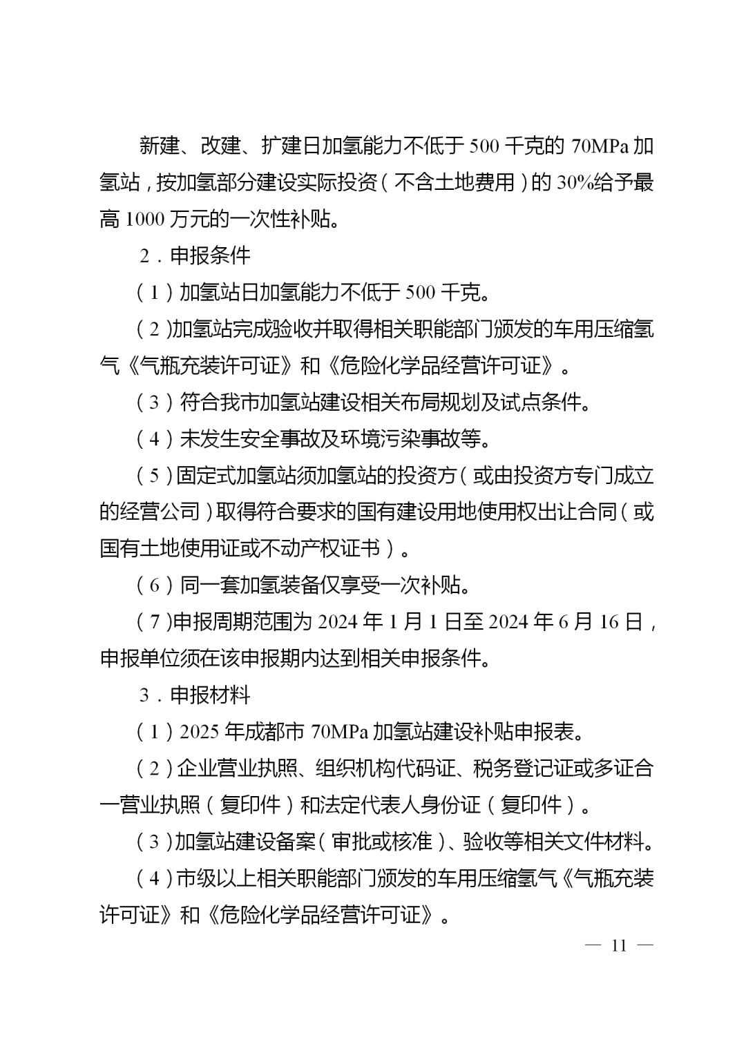 近日,成都市經(jīng)濟和信息化局關(guān)于組織開展2025年成都市先進能源產(chǎn)業(yè)相關(guān)項目申報工作的通知。 01 支持綠電制氫 對制氫設(shè)計能力500標方/小時以上(含500標方/小時)的電解水制氫企業(yè),按實際電解水制氫用電量給予0.15-0.20元/千瓦時的電費補貼,每年補貼額度最高不超過2000萬元。上述補貼由成都市及企業(yè)所在區(qū)(市)縣兩級共同分擔,分擔比例參照對市級重大產(chǎn)業(yè)化項目屬地區(qū)(市)縣補助的基礎(chǔ)比例執(zhí)行。 02 加氫站建設(shè)補貼 支持固定式加氫站建設(shè)補貼。對新建、改建、擴建日加氫能力不低于500千克的35MPa固定式加氫站(含具有加氫功能的綜合能源站),按加氫部分建設(shè)實際投資(不含土地費用)的30%給予最高500萬元的一次性補貼。 支持臨時加氫站建設(shè)補貼。對新建日加氫能力不低于500千克的35MPa臨時加氫站,且正式運營(以首張售氫發(fā)票日期計)一年以上,按加氫部分建設(shè)實際投資(不含土地費用)的10%給予最高100萬元的一次性補貼。 支持臨時加氫站改建為固定式加氫站建設(shè)補貼。臨時加氫站取得原址國有建設(shè)用地使用權(quán)出讓合同(或國有土地使用證或不動產(chǎn)權(quán)證書)及危化品經(jīng)營許可證后,對符合固定式加氫站標準〔日加氫能力不低于500千克的35MPa固定式加氫站(含具有加氫功能的綜合能源站)〕的,將根據(jù)加氫部分初次建設(shè)實際投資(不含土地費用)的30%給予扣除已獲得臨時加氫站建設(shè)補貼后的一次性差額補貼,補貼總額不超過500萬元。 支持70MPa加氫站建設(shè)補貼。新建、改建、擴建日加氫能力不低于500千克的70MPa加氫站,按加氫部分建設(shè)實際投資(不含土地費用)的30%給予最高1000萬元的一次性補貼。 支持制氫加氫一體站建設(shè)補貼。符合條件的“制氫-加氫”示范一體站,按加氫部分建設(shè)實際投資(不含土地費用)的30%給予最高1000萬元的一次性補貼。 支持加氫站建設(shè): (1)對新建日加氫能力500千克至1000千克、1000千克及以上的35MPa臨時加氫站,分別給予100萬元、200萬元的一次性補貼。 (2)對新建日加氫能力500千克至1000千克、1000千克及以上的70MPa臨時加氫站,分別給予200萬元、300萬元的一次性補貼。 (3)對新建日加氫能力500千克至1000千克、1000千克及以上的 35MPa固定式加氫站(含具有加氫功能的綜合能源站),分別給予300萬元、500萬元的一次性補貼;對改建、擴建加氫能力500千克至1000千克、1000千克及以上的35MPa固定式加氫站(含具有加氫功能的綜合能源站),按加氫部分建設(shè)實際投資(不含土地費用)的50%分別給予最高300萬元、500萬元的一次性補貼。 (4)對新建日加氫能力500千克至1000千克、1000千克及以上的70MPa固定式加氫站(含具有加氫功能的綜合能源站),分別給予600萬元、800萬元的一次性補貼;對改建、擴建加氫能力500千克至1000千克、1000千克及以上的70MPa 固定式加氫站(含具有加氫功能的綜合能源站), 按加氫部分建設(shè)實際投資(不含土地費用)的50%分別給予最高600萬元、800萬元的一次性補貼。 (5)給予日加氫能力不低于500千克的制氫加氫一體站1000萬元的一次性補貼;給予日加氫能力不低于500千克的液態(tài)加氫站1000萬元的一次性補貼。 03 加氫站運營補貼 2024年1月1日至2024年6月16日對日加氫能力不低于500千克且銷售價格不高于35元/千克的加氫站,按照累計加氫量,給予每千克20元、最高500萬元的運營補貼。 2024年6月17日至2024年12月31日對提供加氫服務并且銷售價格不高于30元/千克、日加氫能力不低于500千克的加氫站,按照累計加氫量,給予每千克20元、最高500萬元的運營補貼(入選國家氫燃料電池汽車示范群后,對提供加氫服務并且銷售價格不高于25元/千克、日加氫能力不低于500千克的加氫站,按照累計加氫量,給予每千克20元、最高500萬元的運營補貼)。 全文如下: