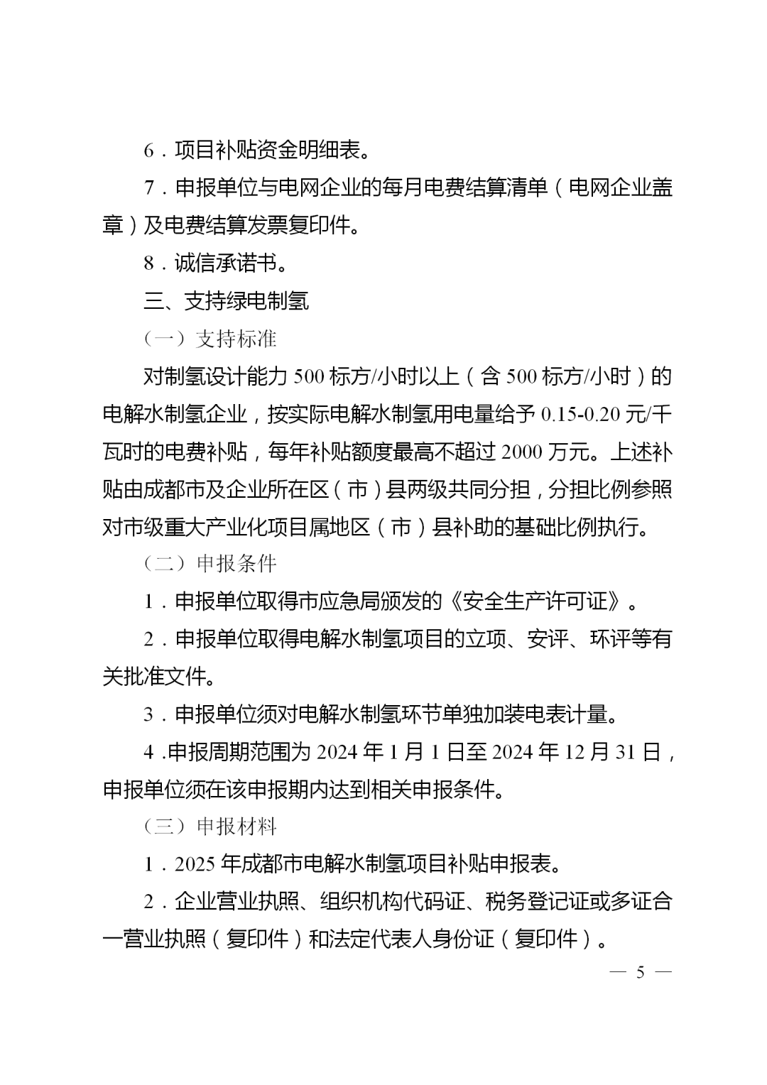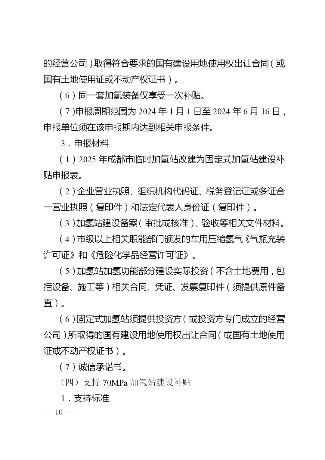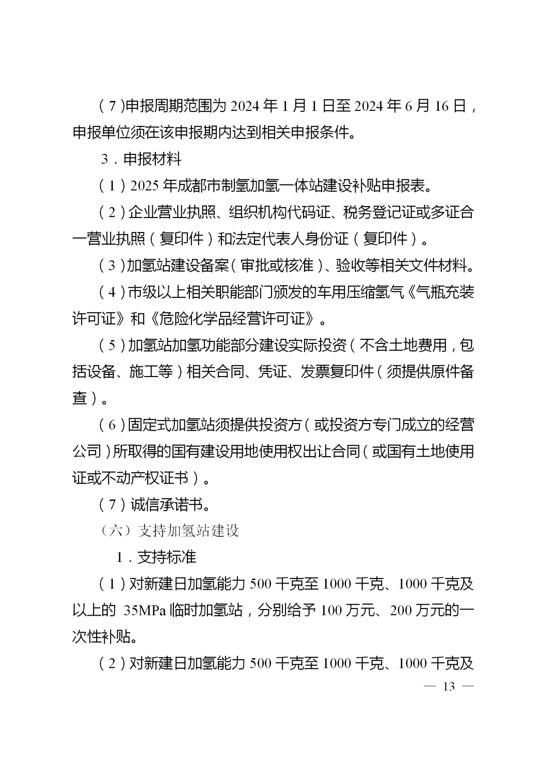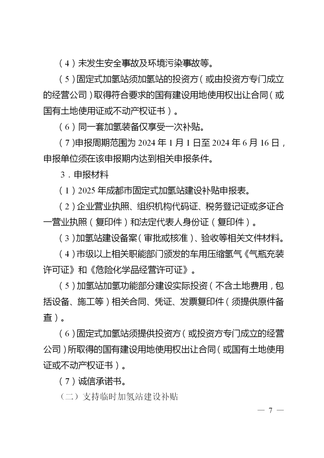 近日,成都市經(jīng)濟和信息化局關(guān)于組織開展2025年成都市先進能源產(chǎn)業(yè)相關(guān)項目申報工作的通知。 01 支持綠電制氫 對制氫設(shè)計能力500標方/小時以上(含500標方/小時)的電解水制氫企業(yè),按實際電解水制氫用電量給予0.15-0.20元/千瓦時的電費補貼,每年補貼額度最高不超過2000萬元。上述補貼由成都市及企業(yè)所在區(qū)(市)縣兩級共同分擔,分擔比例參照對市級重大產(chǎn)業(yè)化項目屬地區(qū)(市)縣補助的基礎(chǔ)比例執(zhí)行。 02 加氫站建設(shè)補貼 支持固定式加氫站建設(shè)補貼。對新建、改建、擴建日加氫能力不低于500千克的35MPa固定式加氫站(含具有加氫功能的綜合能源站),按加氫部分建設(shè)實際投資(不含土地費用)的30%給予最高500萬元的一次性補貼。 支持臨時加氫站建設(shè)補貼。對新建日加氫能力不低于500千克的35MPa臨時加氫站,且正式運營(以首張售氫發(fā)票日期計)一年以上,按加氫部分建設(shè)實際投資(不含土地費用)的10%給予最高100萬元的一次性補貼。 支持臨時加氫站改建為固定式加氫站建設(shè)補貼。臨時加氫站取得原址國有建設(shè)用地使用權(quán)出讓合同(或國有土地使用證或不動產(chǎn)權(quán)證書)及危化品經(jīng)營許可證后,對符合固定式加氫站標準〔日加氫能力不低于500千克的35MPa固定式加氫站(含具有加氫功能的綜合能源站)〕的,將根據(jù)加氫部分初次建設(shè)實際投資(不含土地費用)的30%給予扣除已獲得臨時加氫站建設(shè)補貼后的一次性差額補貼,補貼總額不超過500萬元。 支持70MPa加氫站建設(shè)補貼。新建、改建、擴建日加氫能力不低于500千克的70MPa加氫站,按加氫部分建設(shè)實際投資(不含土地費用)的30%給予最高1000萬元的一次性補貼。 支持制氫加氫一體站建設(shè)補貼。符合條件的“制氫-加氫”示范一體站,按加氫部分建設(shè)實際投資(不含土地費用)的30%給予最高1000萬元的一次性補貼。 支持加氫站建設(shè): (1)對新建日加氫能力500千克至1000千克、1000千克及以上的35MPa臨時加氫站,分別給予100萬元、200萬元的一次性補貼。 (2)對新建日加氫能力500千克至1000千克、1000千克及以上的70MPa臨時加氫站,分別給予200萬元、300萬元的一次性補貼。 (3)對新建日加氫能力500千克至1000千克、1000千克及以上的 35MPa固定式加氫站(含具有加氫功能的綜合能源站),分別給予300萬元、500萬元的一次性補貼;對改建、擴建加氫能力500千克至1000千克、1000千克及以上的35MPa固定式加氫站(含具有加氫功能的綜合能源站),按加氫部分建設(shè)實際投資(不含土地費用)的50%分別給予最高300萬元、500萬元的一次性補貼。 (4)對新建日加氫能力500千克至1000千克、1000千克及以上的70MPa固定式加氫站(含具有加氫功能的綜合能源站),分別給予600萬元、800萬元的一次性補貼;對改建、擴建加氫能力500千克至1000千克、1000千克及以上的70MPa 固定式加氫站(含具有加氫功能的綜合能源站), 按加氫部分建設(shè)實際投資(不含土地費用)的50%分別給予最高600萬元、800萬元的一次性補貼。 (5)給予日加氫能力不低于500千克的制氫加氫一體站1000萬元的一次性補貼;給予日加氫能力不低于500千克的液態(tài)加氫站1000萬元的一次性補貼。 03 加氫站運營補貼 2024年1月1日至2024年6月16日對日加氫能力不低于500千克且銷售價格不高于35元/千克的加氫站,按照累計加氫量,給予每千克20元、最高500萬元的運營補貼。 2024年6月17日至2024年12月31日對提供加氫服務并且銷售價格不高于30元/千克、日加氫能力不低于500千克的加氫站,按照累計加氫量,給予每千克20元、最高500萬元的運營補貼(入選國家氫燃料電池汽車示范群后,對提供加氫服務并且銷售價格不高于25元/千克、日加氫能力不低于500千克的加氫站,按照累計加氫量,給予每千克20元、最高500萬元的運營補貼)。 全文如下:
