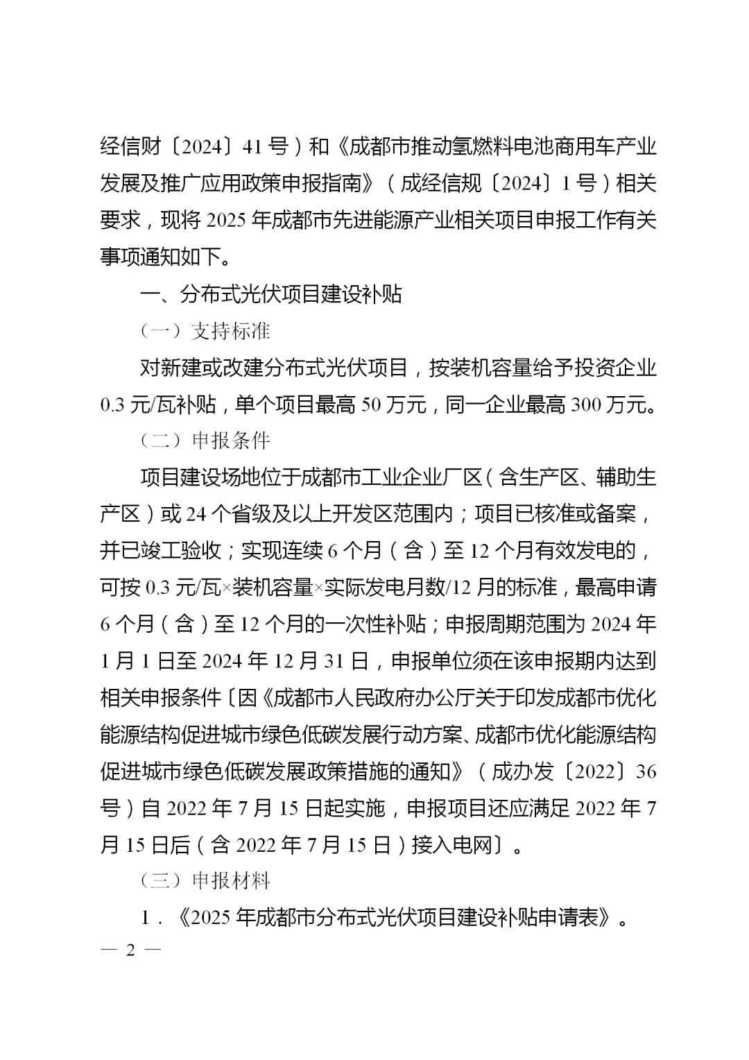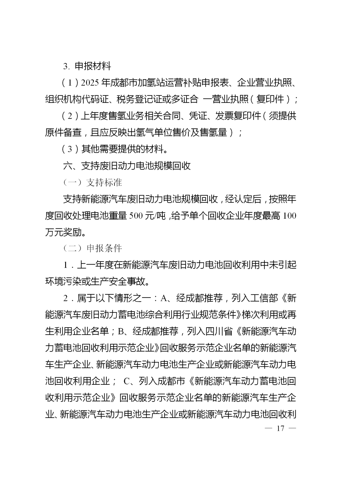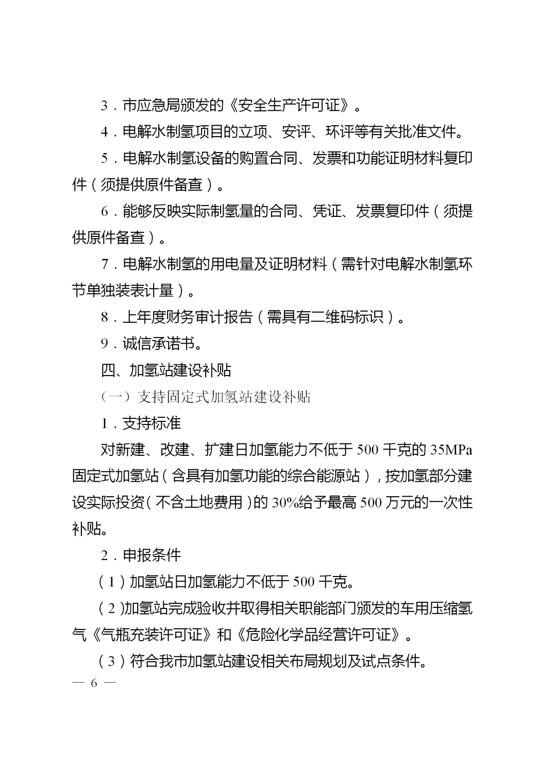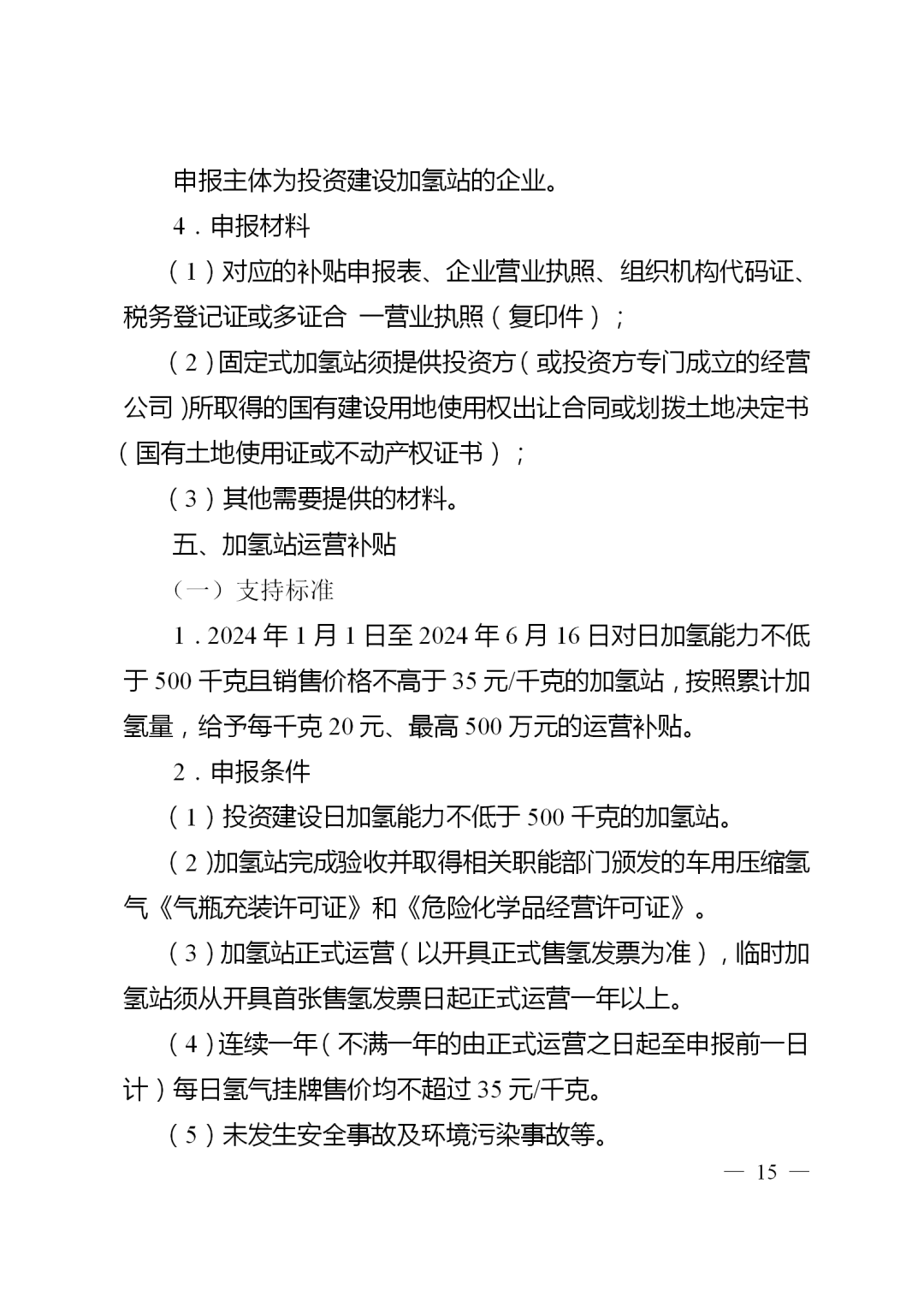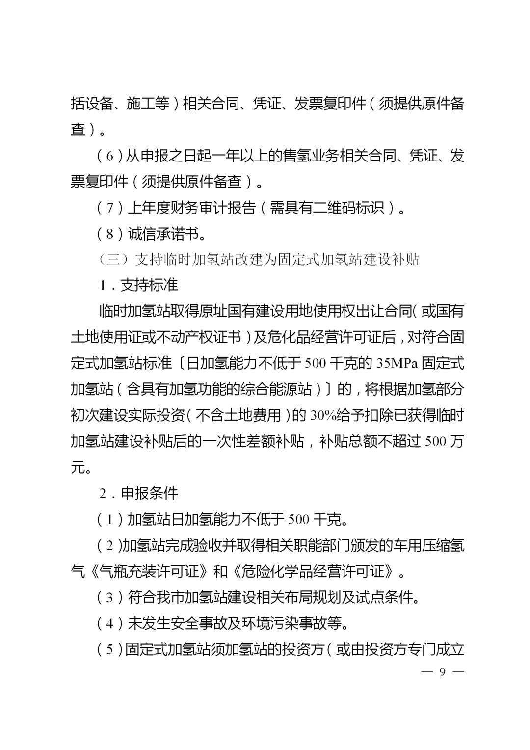 近日,成都市經(jīng)濟和信息化局關(guān)于組織開展2025年成都市先進能源產(chǎn)業(yè)相關(guān)項目申報工作的通知。 01 支持綠電制氫 對制氫設(shè)計能力500標方/小時以上(含500標方/小時)的電解水制氫企業(yè),按實際電解水制氫用電量給予0.15-0.20元/千瓦時的電費補貼,每年補貼額度最高不超過2000萬元。上述補貼由成都市及企業(yè)所在區(qū)(市)縣兩級共同分擔,分擔比例參照對市級重大產(chǎn)業(yè)化項目屬地區(qū)(市)縣補助的基礎(chǔ)比例執(zhí)行。 02 加氫站建設(shè)補貼 支持固定式加氫站建設(shè)補貼。對新建、改建、擴建日加氫能力不低于500千克的35MPa固定式加氫站(含具有加氫功能的綜合能源站),按加氫部分建設(shè)實際投資(不含土地費用)的30%給予最高500萬元的一次性補貼。 支持臨時加氫站建設(shè)補貼。對新建日加氫能力不低于500千克的35MPa臨時加氫站,且正式運營(以首張售氫發(fā)票日期計)一年以上,按加氫部分建設(shè)實際投資(不含土地費用)的10%給予最高100萬元的一次性補貼。 支持臨時加氫站改建為固定式加氫站建設(shè)補貼。臨時加氫站取得原址國有建設(shè)用地使用權(quán)出讓合同(或國有土地使用證或不動產(chǎn)權(quán)證書)及危化品經(jīng)營許可證后,對符合固定式加氫站標準〔日加氫能力不低于500千克的35MPa固定式加氫站(含具有加氫功能的綜合能源站)〕的,將根據(jù)加氫部分初次建設(shè)實際投資(不含土地費用)的30%給予扣除已獲得臨時加氫站建設(shè)補貼后的一次性差額補貼,補貼總額不超過500萬元。 支持70MPa加氫站建設(shè)補貼。新建、改建、擴建日加氫能力不低于500千克的70MPa加氫站,按加氫部分建設(shè)實際投資(不含土地費用)的30%給予最高1000萬元的一次性補貼。 支持制氫加氫一體站建設(shè)補貼。符合條件的“制氫-加氫”示范一體站,按加氫部分建設(shè)實際投資(不含土地費用)的30%給予最高1000萬元的一次性補貼。 支持加氫站建設(shè): (1)對新建日加氫能力500千克至1000千克、1000千克及以上的35MPa臨時加氫站,分別給予100萬元、200萬元的一次性補貼。 (2)對新建日加氫能力500千克至1000千克、1000千克及以上的70MPa臨時加氫站,分別給予200萬元、300萬元的一次性補貼。 (3)對新建日加氫能力500千克至1000千克、1000千克及以上的 35MPa固定式加氫站(含具有加氫功能的綜合能源站),分別給予300萬元、500萬元的一次性補貼;對改建、擴建加氫能力500千克至1000千克、1000千克及以上的35MPa固定式加氫站(含具有加氫功能的綜合能源站),按加氫部分建設(shè)實際投資(不含土地費用)的50%分別給予最高300萬元、500萬元的一次性補貼。 (4)對新建日加氫能力500千克至1000千克、1000千克及以上的70MPa固定式加氫站(含具有加氫功能的綜合能源站),分別給予600萬元、800萬元的一次性補貼;對改建、擴建加氫能力500千克至1000千克、1000千克及以上的70MPa 固定式加氫站(含具有加氫功能的綜合能源站), 按加氫部分建設(shè)實際投資(不含土地費用)的50%分別給予最高600萬元、800萬元的一次性補貼。 (5)給予日加氫能力不低于500千克的制氫加氫一體站1000萬元的一次性補貼;給予日加氫能力不低于500千克的液態(tài)加氫站1000萬元的一次性補貼。 03 加氫站運營補貼 2024年1月1日至2024年6月16日對日加氫能力不低于500千克且銷售價格不高于35元/千克的加氫站,按照累計加氫量,給予每千克20元、最高500萬元的運營補貼。 2024年6月17日至2024年12月31日對提供加氫服務并且銷售價格不高于30元/千克、日加氫能力不低于500千克的加氫站,按照累計加氫量,給予每千克20元、最高500萬元的運營補貼(入選國家氫燃料電池汽車示范群后,對提供加氫服務并且銷售價格不高于25元/千克、日加氫能力不低于500千克的加氫站,按照累計加氫量,給予每千克20元、最高500萬元的運營補貼)。 全文如下: