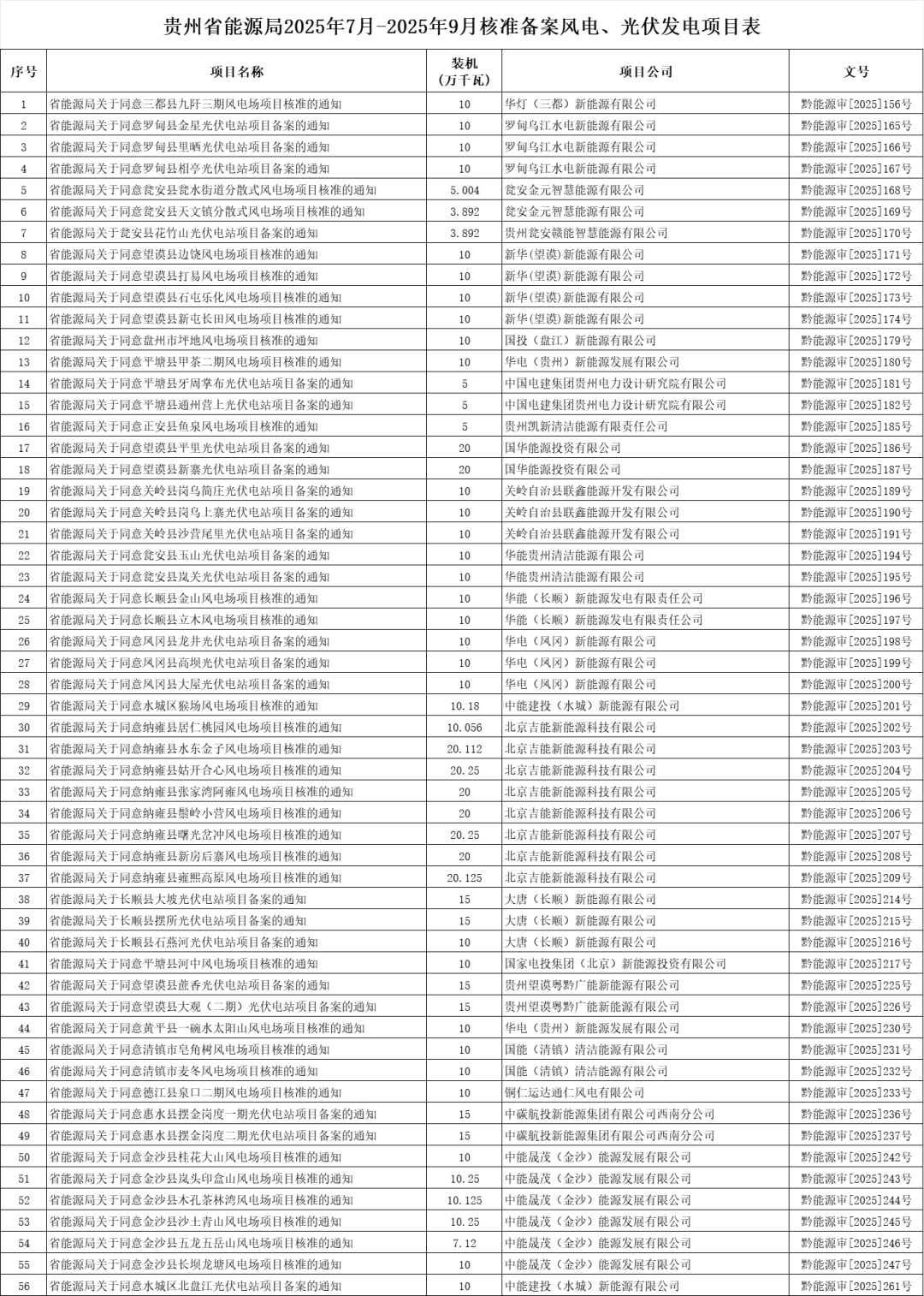 10月11日,貴州省能源局發(fā)布2025年7月-2025年9月核準備案風電光伏發(fā)電項目情況。 根據(jù)公告,該日期內(nèi)核準備案風電、光伏發(fā)電項目56個,總規(guī)模近6.5GW。其中,國家電投獲得約1.75GW風光項目,華電集團、國家能源集團分別獲得800MW、600MW項目。 詳情見下: 下一篇: 注資4億!天合光能加碼風電