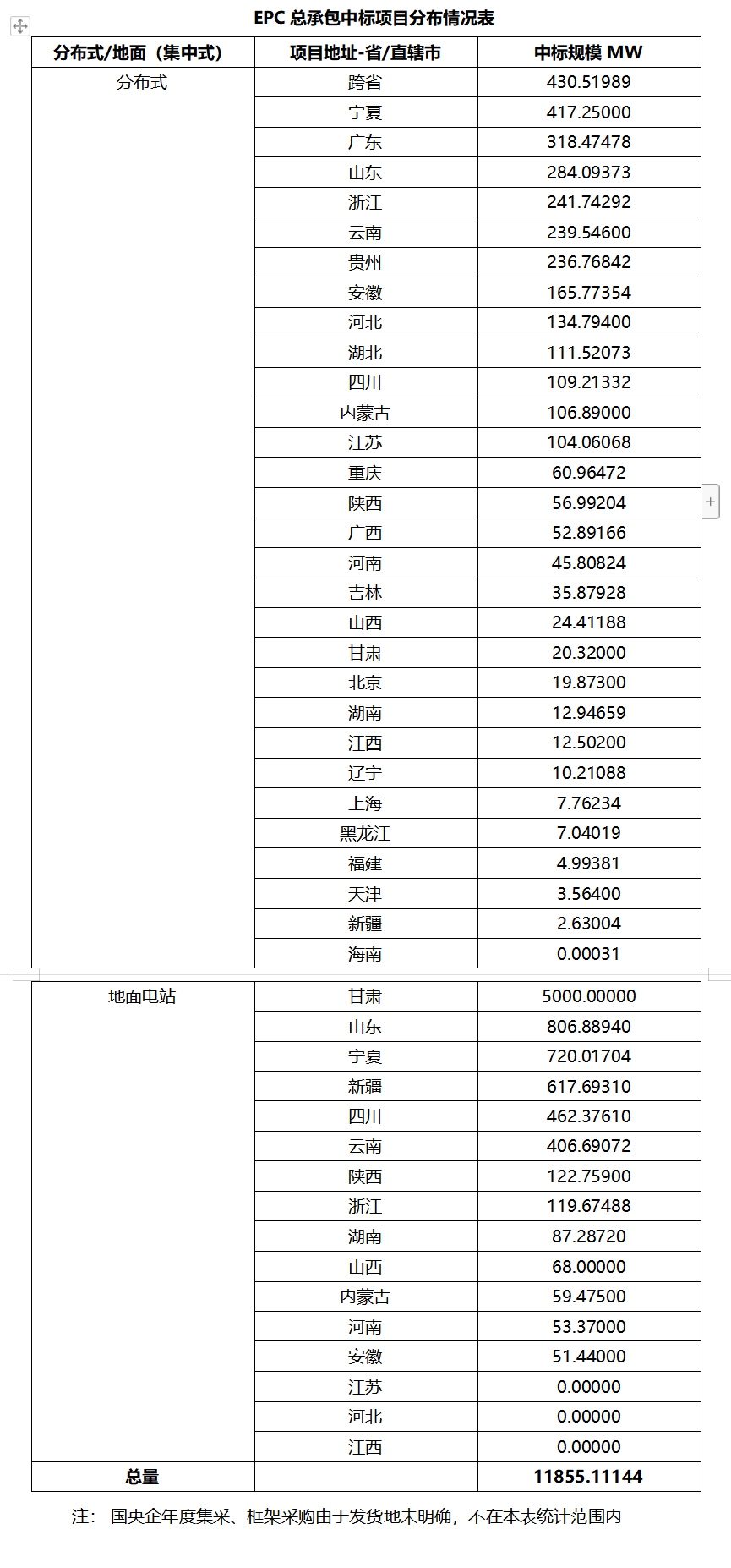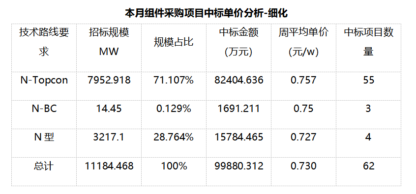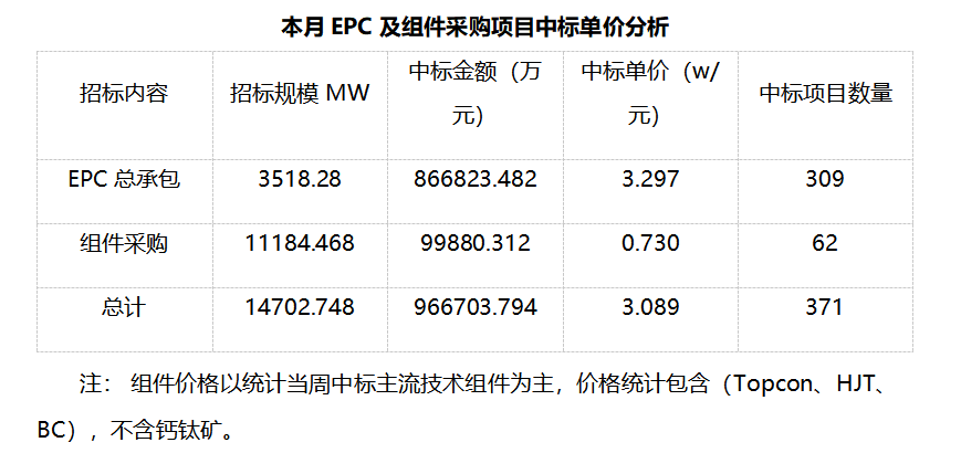 一、光伏項目招標情況匯總: 根據(jù)Gessey蓋錫咨詢統(tǒng)計,2025年9月01日-9月30日累計光伏招標項目為677個,項目規(guī)模合計為34319.731MW。光伏組件采購招標項目為110個,招標規(guī)模為21301.23MW,,環(huán)比上周194.229%。EPC總承包招標項目為567個,招標規(guī)模為13018.501MW,,環(huán)比上周398.979%。 我們統(tǒng)計包含大型央企國企、地方能源集團、地方政府機關(guān)、兩大電網(wǎng)、央企總包企業(yè)、知名光伏企業(yè)等,其中央企總包企業(yè)占總招標規(guī)模較高,具體各企業(yè)排名如下表: 二、中標項目分布類型匯總情況 本月中標項目需求按照招標場景地分布,分布式光伏主要集中在跨省、寧夏、廣東、山東等地區(qū);集中式光伏主要集中在甘肅等地區(qū)。 三、EPC總承包及組件采購情況匯總 本月光伏EPC總承包中標規(guī)模達3518.28MW,總中標金額866823.482萬元,平均中標單價為3.297元/W,中標數(shù)量309個。 本月光伏組件采購中標規(guī)模達11184.468MW,總中標金額99880.312萬元,平均中標單價為0.730元/W,中標數(shù)量62個。