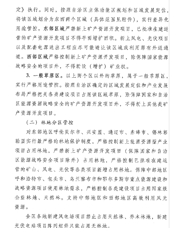 草原區(qū)包括: 生態(tài)保護(hù)紅線內(nèi)草原區(qū)是內(nèi)蒙古草原生態(tài)系統(tǒng)的核心區(qū),屬禁止開發(fā)區(qū)域。 生態(tài)保護(hù)紅線外的基本草原區(qū)是草原生態(tài)系統(tǒng)的重要保護(hù)區(qū),實(shí)行嚴(yán)格保護(hù)措施。將該區(qū)域劃分為東西兩個(gè)區(qū)域。 東部區(qū)域嚴(yán)禁新上礦產(chǎn)資源開發(fā)項(xiàng)目,已批準(zhǔn)在建運(yùn)營(yíng)的礦產(chǎn)資源開發(fā)項(xiàng)目不得平面增擴(kuò)面積。新上風(fēng)電、光伏項(xiàng)目以及配套電源送出 工程 應(yīng)盡可能避讓該區(qū)域或利用原有外送通道。 西部區(qū)域嚴(yán)格控制新上礦產(chǎn)資源開發(fā)項(xiàng)目,除保障國(guó)家能源戰(zhàn)略安全的項(xiàng)目外,不得新設(shè)(增擴(kuò))礦業(yè)權(quán)。 林區(qū)管控包括: 對(duì)東部地區(qū)呼倫貝爾市、興安盟、通遼市、赤峰市、錫林郭勒盟實(shí)行最嚴(yán)格的林地保護(hù)制度,嚴(yán)格控制新上能源資源型產(chǎn)業(yè)項(xiàng)目占用林地,嚴(yán)禁新上礦產(chǎn)資源開發(fā)項(xiàng)目(保障國(guó)家和自治區(qū)能源戰(zhàn)略安全項(xiàng)目除外)占用林地,嚴(yán)格控制已批準(zhǔn)在建運(yùn)營(yíng)的礦山、風(fēng)電、光伏等各類項(xiàng)目新增占用林地。 保障中部地區(qū)呼和浩特市、包頭市、烏蘭察布市和鄂爾多斯市重點(diǎn)能源建設(shè)和戰(zhàn)略資源項(xiàng)目使用林地需求,嚴(yán)格控制各類建設(shè)項(xiàng)目占用國(guó)家級(jí)公益林地、天然林。 支持中部地區(qū)和西部地區(qū)高效利用風(fēng)光資源全區(qū)各地新建風(fēng)電場(chǎng)項(xiàng)目禁止占用天然林、喬木林地,新建光伏電站項(xiàng)目陣列組件只能占用無(wú)林地。