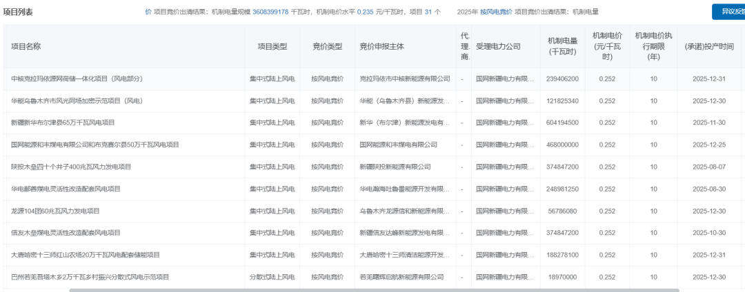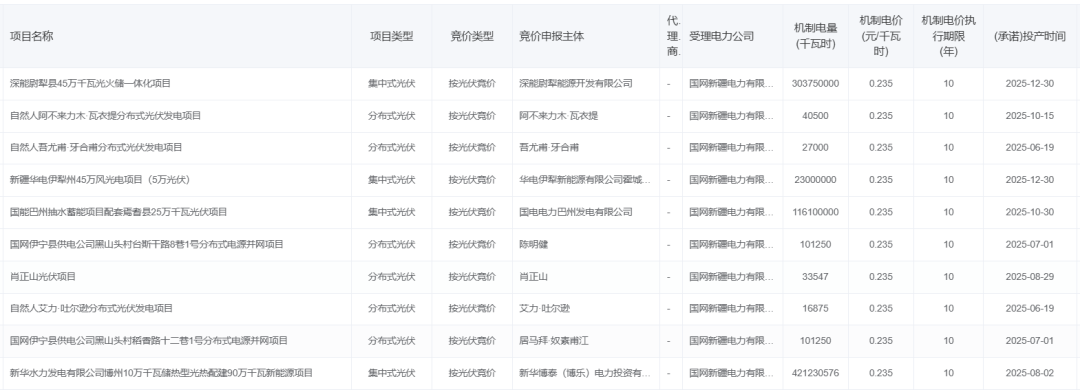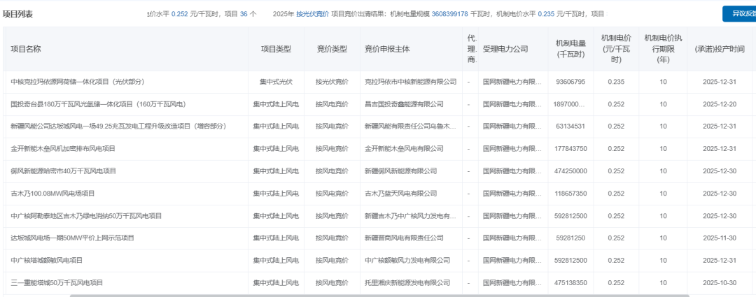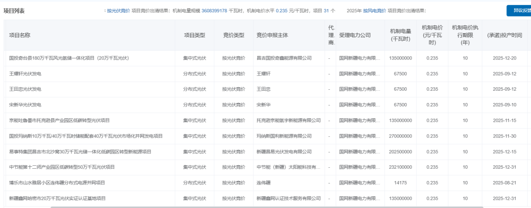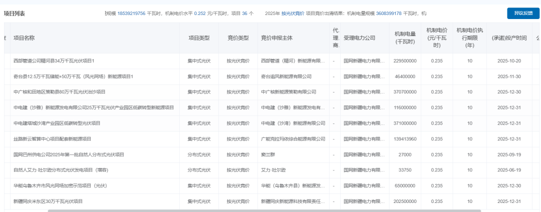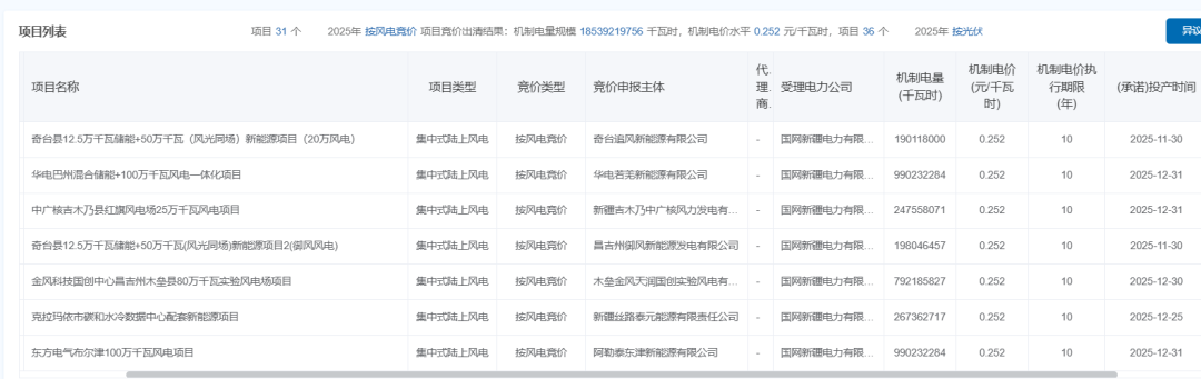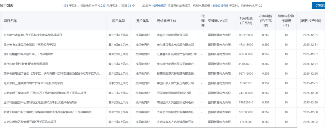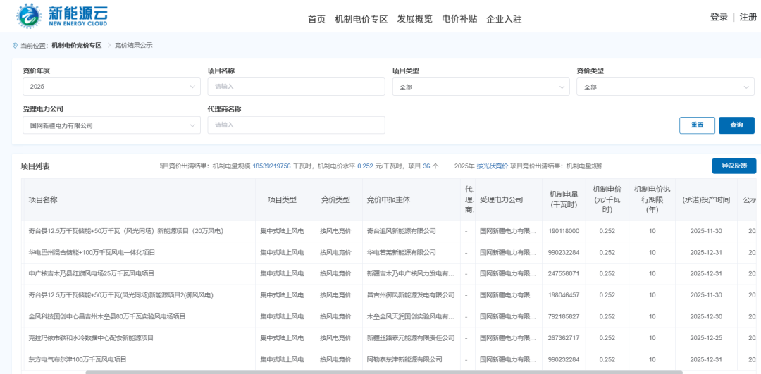 10月15日,國網(wǎng)新疆電力有限公司公示2025年度增量新能源項目機制電價競價結(jié)果。 根據(jù)公示,新疆維吾爾自治區(qū)2025年度增量新能源項目機制電價:(項目見后) 風(fēng)電機制電量規(guī)模18,539,219,756千瓦時,機制電價0.252元/千瓦時,項目36個,其中集中式陸風(fēng)項目34個,分散式陸風(fēng)項目2個; 光伏機制電量規(guī)模3,608,399,178千瓦時,機制電價0.235元/千瓦時,項目31個。 本次機制電價競價結(jié)果通過國網(wǎng)新能源云平臺公布,查詢方式見下: 據(jù)了解,9月30日,國網(wǎng)新疆電力發(fā)布《新疆維吾爾自治區(qū)2025年度增量新能源項目機制電價競價公告》。 公告顯示,按照電源類型風(fēng)電與太陽能(含分布式光伏)分類競價,電價區(qū)間均為0.150元/千瓦時~0.262元/千瓦時。機制電價執(zhí)行期限為10年。 風(fēng)電項目機制電量總規(guī)模為1,853,921.9755萬千瓦時、太陽能(含分布式光伏)機制電量總規(guī)模為360,839.9178萬千瓦時。 風(fēng)電、太陽能(含分布式光伏)單個項目機制電量申報上限計算比例為62.5%。