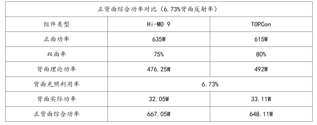 在綜合功率計(jì)算方面,基于山東煙臺(tái)實(shí)證基地6.73%背面反射率的實(shí)際環(huán)境條件,Hi-MO 9組件的正背面綜合功率達(dá)到667.05W,顯著高于TOPCon組件的648.11W,在實(shí)際應(yīng)用場(chǎng)景中展現(xiàn)出更強(qiáng)的功率輸出能力。