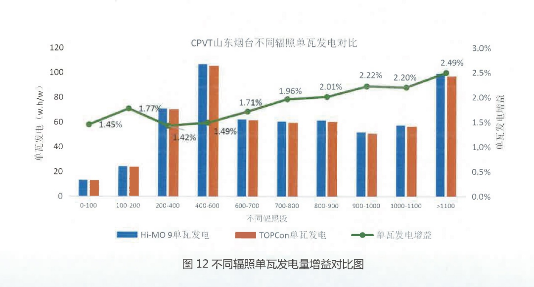 尤為值得關(guān)注的是,Hi-MO 9組件的性能優(yōu)勢(shì)呈現(xiàn)出全時(shí)段、全輻照度的普遍性特征。從清晨5:00至傍晚17:00的各個(gè)監(jiān)測(cè)時(shí)段,以及在0-1100W/㎡的各輻照區(qū)間內(nèi),Hi-MO 9組件均保持對(duì)TOPCon組件的穩(wěn)定正增益。