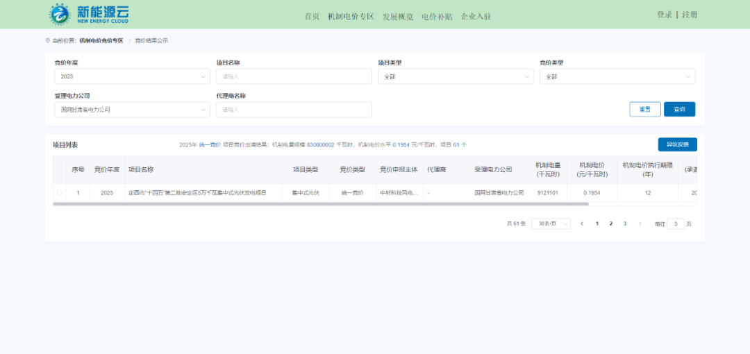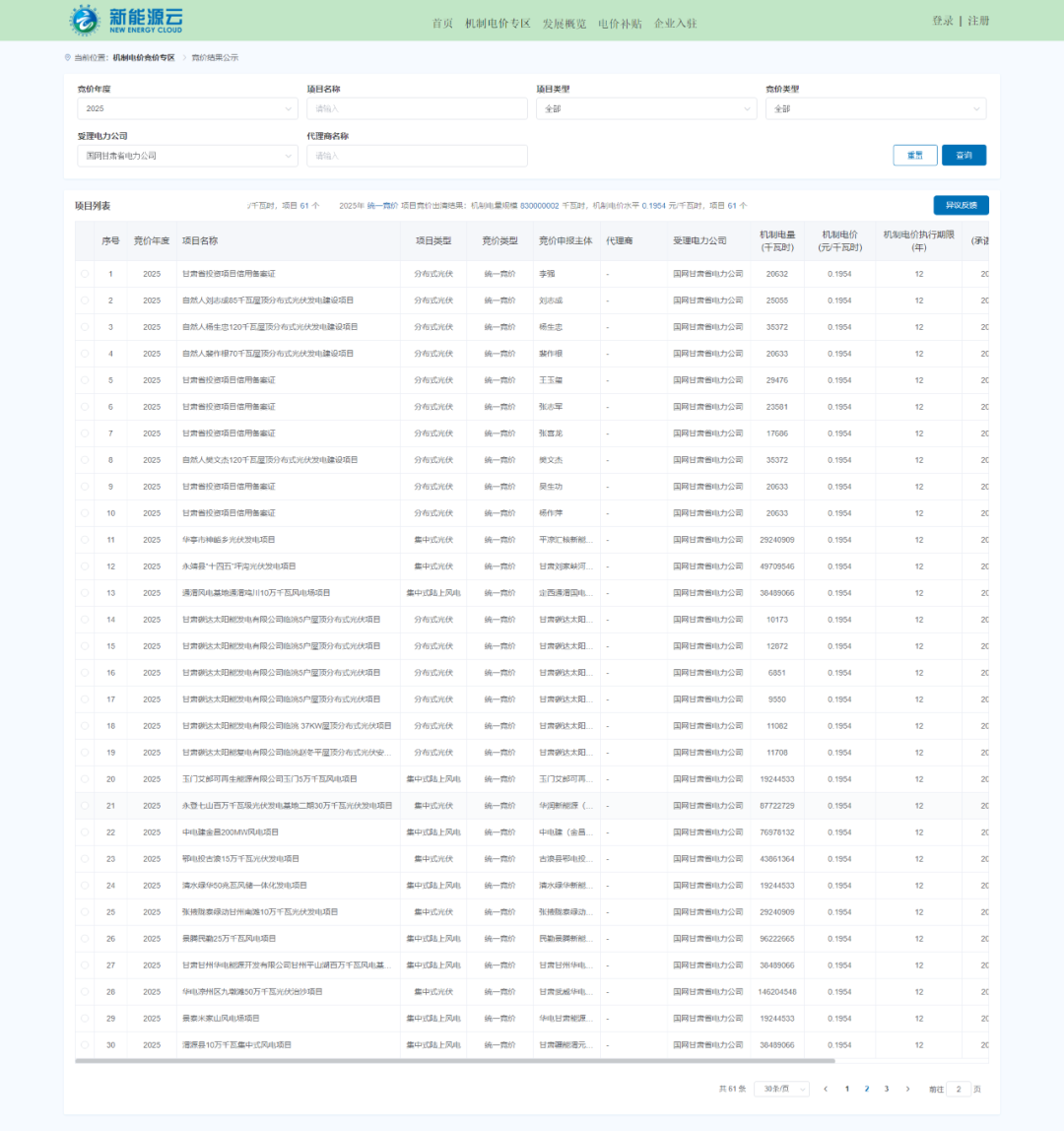10月16日,國(guó)網(wǎng)新能源云平臺(tái)公示甘肅省機(jī)制電價(jià)結(jié)果,其中,機(jī)制電量規(guī)模8.3億千瓦時(shí),風(fēng)電、光伏項(xiàng)目機(jī)制電價(jià)均為0.1954元/千瓦時(shí),共61個(gè)項(xiàng)目中標(biāo)。 根據(jù)甘肅136號(hào)文,2025年甘肅省分兩個(gè)批次組織新能源同權(quán)競(jìng)價(jià):第一批次為2025年6月1日至2025年12月31日期間已投產(chǎn)和計(jì)劃投產(chǎn)的新能源項(xiàng)目。第二批次為2026年1月1日至2026年12月31日期間已投產(chǎn)和計(jì)劃投產(chǎn)、且未納入過(guò)機(jī)制執(zhí)行范圍的新能源項(xiàng)目。 首批競(jìng)價(jià)項(xiàng)目,納入機(jī)制范圍的電量規(guī)模為8.3億千瓦時(shí)。第二批次的競(jìng)價(jià)項(xiàng)目,納入機(jī)制范圍的電量規(guī)模為15.2億千瓦時(shí)。 電價(jià)方面,競(jìng)價(jià)上限為0.2447元/千瓦時(shí),競(jìng)價(jià)下限為0.1954元/千瓦時(shí),從甘肅結(jié)果可以看到,風(fēng)光機(jī)制電價(jià)均為下限電價(jià)。 部分入圍項(xiàng)目如下: