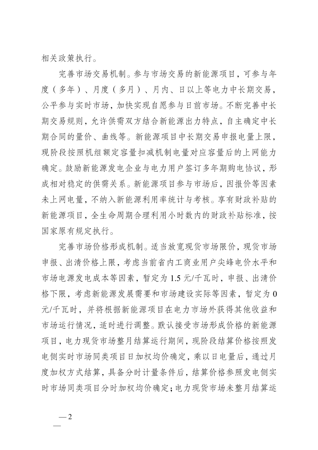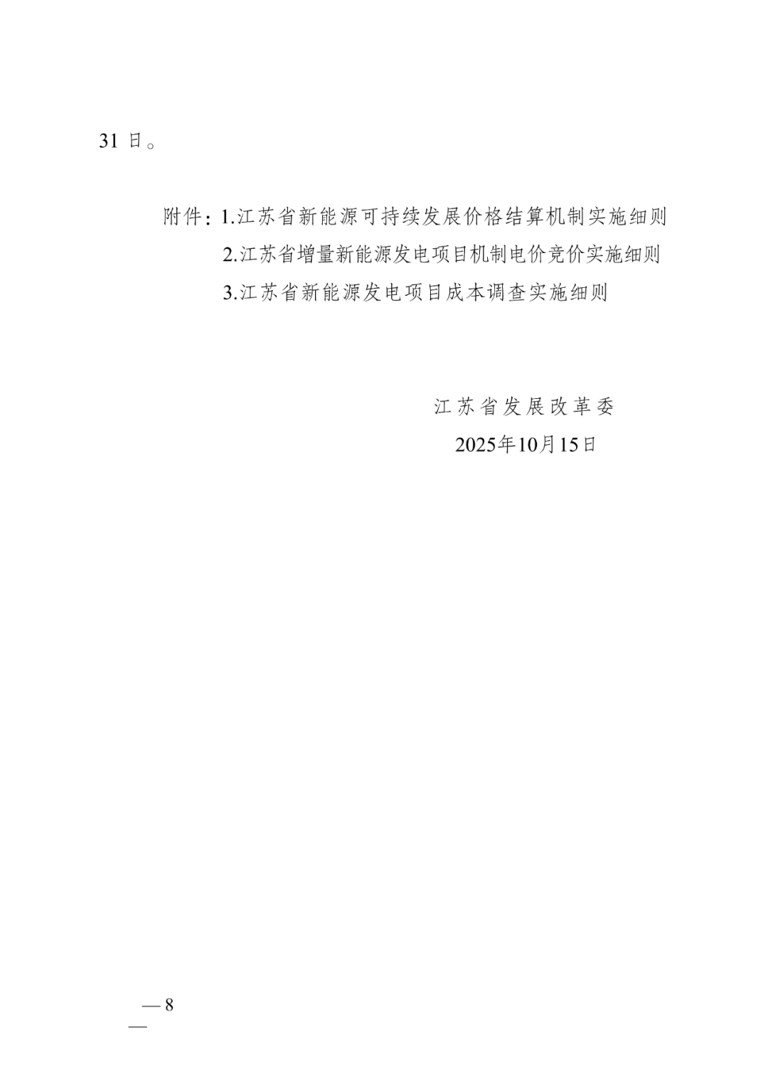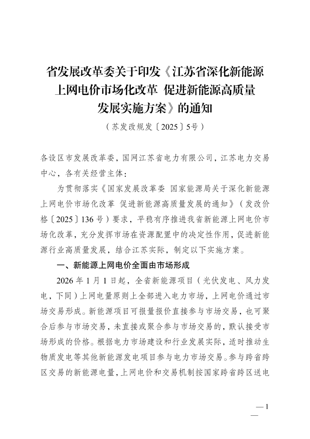 10月17日,江蘇省發(fā)改委正式印發(fā)《江蘇省深化新能源上網電價市場化改革促進新能源高質量發(fā)展實施方案》。 詳情見下(附政策解讀): 《江蘇省深化新能源上網電價市場化改革 促進新能源高質量發(fā)展實施方案》 問答式政策解讀 1.實施方案出臺背景和主要內容是什么? 答:為貫徹落實國家發(fā)展改革委、國家能源局《關于深化新能源上網電價市場化改革 促進新能源高質量發(fā)展的通知》(發(fā)改價格〔2025〕136號)部署要求,結合江蘇新能源發(fā)展實際,制定我省實施方案。通過穩(wěn)定存量項目收益預期、激發(fā)增量項目投資活力,推動新能源項目全面入市交易,促進新能源行業(yè)高質量發(fā)展。 實施方案主要包括三方面內容: 一是新能源上網電價全面由市場形成。2026年1月1日起,全省光伏發(fā)電、風力發(fā)電項目上網電量原則上全部進入電力市場,上網電價通過市場交易形成。根據電力市場建設和行業(yè)發(fā)展實際,適時推動生物質發(fā)電等其他新能源發(fā)電項目,參與電力市場交易。 二是建立新能源可持續(xù)發(fā)展價格結算機制。新能源項目參與電力市場交易后,在市場外建立差價結算機制。區(qū)分存量和增量,分別明確納入機制的電量規(guī)模、電價水平和執(zhí)行期限。享有財政補貼的項目,全生命周期合理利用小時數內的財政補貼標準,按國家規(guī)定執(zhí)行。 三是健全適應新能源高質量發(fā)展的電力市場交易機制。逐步完善電力中長期交易規(guī)則,加快電力現貨市場建設,推動輔助服務市場發(fā)展。鼓勵新能源發(fā)用雙方簽訂多年期綠電購買協(xié)議,穩(wěn)定項目收益和用戶成本預期。鼓勵新能源項目基于出力特性、調節(jié)性能,自愿配建或租賃儲能,提高項目市場獲利能力。推動新型儲能參與電能量市場、輔助服務市場,有序建立可靠容量補償機制,探索建設容量市場,對電力系統(tǒng)可靠容量給予合理補償。 2.新能源可持續(xù)發(fā)展價格結算機制是什么? 答:新能源項目參與電力市場交易后,在電力市場外建立新能源可持續(xù)發(fā)展價格結算機制,對新能源項目納入機制的電量,對比市場交易價格和機制電價之間的價差,給予多退少補的差價結算,即:當市場交易價格低于機制電價時,給予價差補償;當市場交易價格高于機制電價時,對價差進行回收。相關差價費用納入系統(tǒng)運行費用,由全體工商業(yè)用戶分攤或分享。 3.存量項目和增量項目如何界定?存量項目和增量項目的機制電量、機制電價、執(zhí)行期限分別是如何確定的? 答:存量項目是指2025年6月1日(不含)前已全容量并網的項目,2025年6月1日以前已開展并完成競爭性配置的承諾配建儲能的海上風電項目,視同存量項目。存量項目的機制電量比例設置為90%,其中:戶用分布式光伏項目、光伏扶貧項目機制電量比例為100%。機制電價參考我省燃煤基準價0.391元/千瓦時執(zhí)行。執(zhí)行期限按照項目剩余全生命周期合理利用小時數對應年份與投產滿20年對應年份較早者確定(原特許權風電項目投產發(fā)電利用小時數為滿30000小時)。 增量項目是指2025年6月1日(含)后已全容量并網且未納入過機制的項目。每年根據國家下達的非水電可再生能源電力消納責任權重完成情況和用戶承受能力,動態(tài)調整增量項目機制電量比例,與存量項目適度銜接。每年通過競價形成機制電價,競價分類暫分為海上風電(含海上風光同場建設項目)、光伏(含其他海上光伏項目)和其他風電兩類,分類設置競價上下限。執(zhí)行期限按照同類項目回收初始投資的平均期限確定。具體以每次增量項目競價公告為準。 4.新能源增量項目競價工作將如何開展? 增量項目競價工作,由省發(fā)展改革委會同省能源局、省電力公司、省電力交易中心組織開展。每年組織已投產和預計于次年年底投產、且均未納入過機制的項目,自愿參與機制電價競價。競價時,設置申報充足率和競價上下限,以充分引導競爭。將按項目報價從低到高排序,確定入選項目,機制電價原則上按入選項目的最高報價確定。 開展增量項目競價工作前,省發(fā)展改革委將向社會發(fā)布年度競價通知和競價公告,明確競價電量規(guī)模、競價上下限、執(zhí)行期限等信息。增量項目競價,將全程通過線上方式辦理,集中式、分布式新能源項目可分別登陸“新能源云”平臺、“網上國網”APP,完成網上申報、資格審核、參與競價等流程。 5.本次改革對新能源發(fā)電企業(yè)有什么影響? 對于存量項目,執(zhí)行新的價格機制后,項目擁有較高的保障比例,可保持其平穩(wěn)運行,同時賦予項目自主選擇退出機制的權利,退出機制后可參與綠電交易,獲得綠證收益,項目可結合運營實際和收益預期,進行自主選擇。用存量項目的穩(wěn)定收益預期,增強新能源發(fā)電企業(yè)對增量項目的投資信心,進而帶動增強省內產業(yè)鏈發(fā)展后勁。 對于增量項目,通過合理控制建設成本、有效調控發(fā)電實現與用戶用電的精準匹配,積極開展綠電交易,獲取綠證收益等途徑,可保障投資主體獲得合理回報。具有成本優(yōu)勢、運行管控得當的增量項目,將通過市場獲得高于行業(yè)平均水平的收益,這對于促進新能源行業(yè)高質量發(fā)展將起到積極作用。 6.本次改革對我省終端用戶電價水平有什么