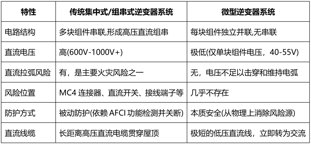 隨著戶用光伏系統(tǒng)的普及,系統(tǒng)安全已成為業(yè)主、安裝商和投資者關注的焦點。在光伏電站的各類風險中,火災最為令人擔憂。在所有光伏火災隱患中, “直流拉弧”就像一個隱蔽而致命的“隱形殺手”,時刻威脅著系統(tǒng)的安全。 那么,是否存在一種方案,能從根源杜絕“直流拉弧”風險呢?答案是微型逆變器(簡稱“微逆”)。其核心原理在于徹底取消了光伏系統(tǒng)中的高壓直流電路。 什么是“直流拉弧”? 簡單來說,“拉弧”就是電流擊穿空氣,產生持續(xù)的火花放電,溫度極高(可達3000℃以上),足以引燃周圍線纜、保溫層等材料。 在傳統(tǒng)集中式或組串式逆變器系統(tǒng)中,多塊太陽能板串聯(lián)形成高壓直流回路,電壓可達600V–1500V。該回路線路長、接頭多,一旦出現(xiàn): ? 接頭虛接、松動 ? 線纜老化、破損 ? 連接器接觸不良 電流在斷開瞬間極易產生直流電弧。直流電弧沒有交流電每秒100次的過零特性,一旦產生便難以自行熄滅,可能持續(xù)燃燒直至引發(fā)火災。 下面我將通過與傳統(tǒng)“集中式/組串式逆變器+直流優(yōu)化器”方案的對比,詳細解釋為什么微逆沒有這個風險。 傳統(tǒng)系統(tǒng)為什么有直流拉弧風險? 在傳統(tǒng)的集中式或組串式逆變器系統(tǒng)中,多塊光伏組件串聯(lián)形成組串。組串的電壓是所有組件電壓的疊加,很容易達到600V、800V甚至1000V以上的高壓直流。 高壓直流是拉弧的“元兇”:直流電弧與交流電弧不同,它沒有過零點(交流電每秒有100/120次電壓自然過零,容易熄滅),一旦被激發(fā),就會持續(xù)燃燒,溫度極高,極易引發(fā)火災。 拉弧的常見位置:這些高壓直流回路中的任何一個連接點都可能成為故障點,例如: ? 組件之間的MC4連接器(安裝不良、老化、進水) ? 直流開關的觸點 ? 逆變器的直流輸入端子 風險場景:在系統(tǒng)運行(發(fā)電)時,如果因為振動、腐蝕、安裝不當?shù)仍驅е逻B接處出現(xiàn)微小間隙,高壓直流電就會擊穿空氣,形成持續(xù)燃燒的電弧。 盡管傳統(tǒng)逆變器通常配備直流電弧故障斷路器(AFCI),通過算法檢測并關斷電路,但這屬于“事后補救”, 仍存在漏判或誤判的可能,無法根除風險。 微逆系統(tǒng)如何從根本上消除風險? 微逆采用“組件級”的直流-交流轉換架構: 1、直流側電壓極低:設計上,微逆最大輸入電壓一般為60V,僅接收單塊組件的直流電(開路電壓通常為40V–55V,工作電壓通常為32V-45V)。 2、不具備拉弧的電壓條件:直流拉弧需要較高的電壓來擊穿空氣間隙。通常認為,直流電壓低于80V時,空氣間隙很難被擊穿并維持電弧。微逆系統(tǒng)直流電壓僅30V–50V,物理上無法擊穿空氣間隙并維持電弧。 3、無長距離高壓直流線路:組件至微逆的直流線路極短(通常<1米),立即轉換為交流電,直流部分被限制在了每塊組件背面極小的范圍內。 4、交流側并網(wǎng):所有的電能輸出和傳輸都是在230V交流電下進行。交流電弧雖然也存在,但其危險性遠低于直流電?。ㄒ驗橛羞^零點易熄滅),且家庭和建筑中的交流電路早已有成熟的保護裝置(如斷路器、漏電保護器等)來應對。