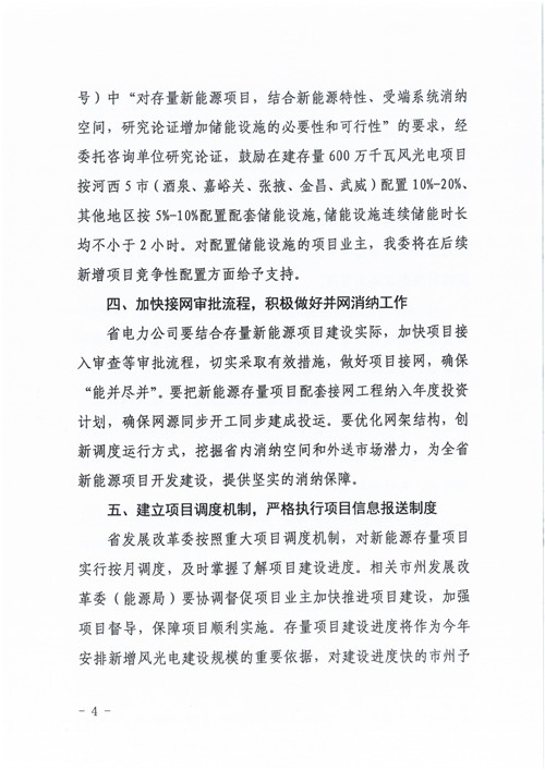 3月25日,甘肅省發(fā)改委發(fā)布《關(guān)于加快推進(jìn)全省新能源存量項(xiàng)目建設(shè)工作》的通知。文件明確,甘肅省目前新能源存量項(xiàng)目約600萬千瓦。其中,光伏發(fā)電項(xiàng)目1.23GW,風(fēng)電4.75GW:包括已核準(zhǔn)未建成風(fēng)電項(xiàng)目180萬千瓦,通渭風(fēng)電基地130萬千瓦風(fēng)電項(xiàng)目,酒湖直流工程配套90萬千瓦風(fēng)電項(xiàng)目以及分散式風(fēng)電75.5萬千瓦項(xiàng)目。 此外,文件還明確鼓勵(lì)配置儲(chǔ)能設(shè)施,鼓勵(lì)全省在建存量600萬千瓦風(fēng)光電項(xiàng)目按河西5市(酒泉、嘉峪關(guān)、張掖、金昌、武威)配置10%-20%、其他地區(qū)按5%-10%配置配套儲(chǔ)能設(shè)施,儲(chǔ)能設(shè)施連續(xù)儲(chǔ)能時(shí)長均不小于2小時(shí)。對(duì)配置儲(chǔ)能設(shè)施的項(xiàng)目業(yè)主,甘肅省發(fā)改委將在后續(xù)新增項(xiàng)目競爭性配置方面給予支持。