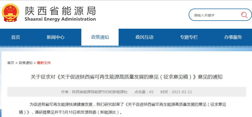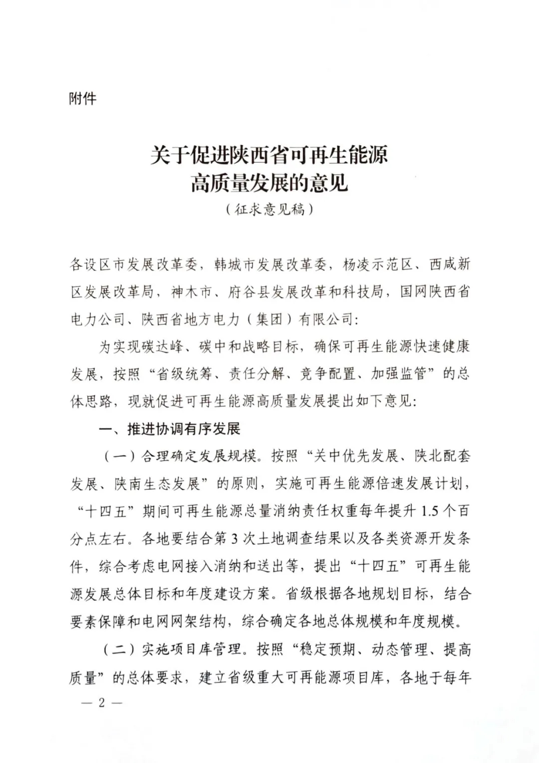 《關(guān)于促進陜西省可再生能源高質(zhì)量發(fā)展的意見》(征求意見稿)陜西2021年新增100MW以上集中式風(fēng)光需配儲能、要求壽命十年以上!2021-03-12 16:16瀏覽數(shù):175次