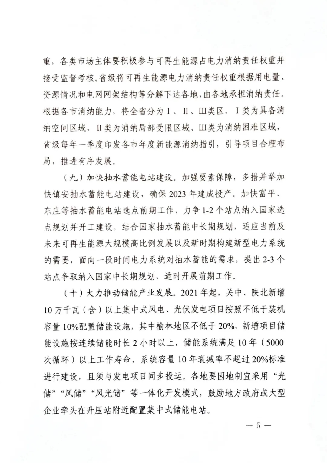3月10日,陜西省能源局印發(fā)《關(guān)于促進陜西省可再生能源高質(zhì)量發(fā)展的意見》(征求意見稿),大力推動儲能產(chǎn)業(yè)發(fā)展! 文件提出,陜西省“十四五”期間可再生能源總量消納責(zé)任權(quán)重每年提升1.5個百分點左右,實行可再生能源倍速發(fā)展計劃。從2021年起,關(guān)中、陜北新增10萬千瓦(含)以上集中式風(fēng)電、光伏發(fā)電項目按照不低于裝機容量10%配置儲能設(shè)施,其中榆林地區(qū)不低于20%,新增項目儲能設(shè)施按連續(xù)儲能時長2小時以上,儲能系統(tǒng)滿足10年(5000次循環(huán))以上工作壽命,系統(tǒng)容量10年衰減率不超過20%標(biāo)準(zhǔn)進行建設(shè),且須與發(fā)電項目同步投運。鼓勵地方政府或大型企業(yè)牽頭在升壓站附近配置集中式儲能電站。 另外文件要求推動源網(wǎng)荷儲一體化和多能互補發(fā)展,增量風(fēng)光儲項目要優(yōu)化儲能配置規(guī)模,充分發(fā)揮調(diào)峰調(diào)頻作用,降低風(fēng)光儲發(fā)電成本。 此外,文件還提出加快抽水蓄能電站建設(shè),加快鎮(zhèn)安抽水蓄能電站建設(shè),確保2023年建成投產(chǎn)。加快富平、東莊等抽水蓄能電站選點前期工作。 詳細要求如下: